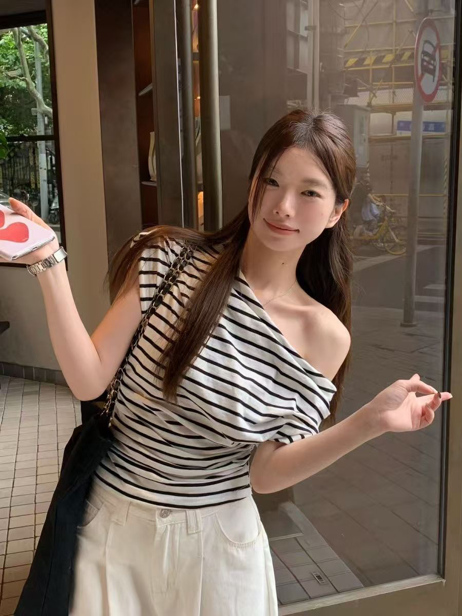 여성을위한 Hanli Hanqi 슬로프 숄더 반팔 티셔츠 2025 여름 새 스타일 핫 소녀 슬림 원 숄더 스트라이프 여성 탑