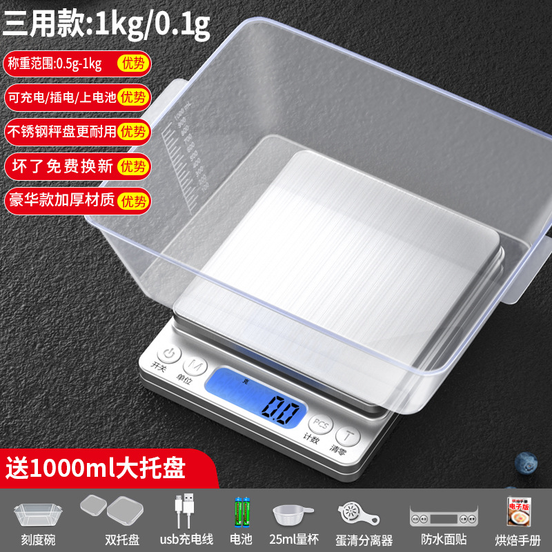 • 충전식 삼용모델 500g/0.01g 무게 + 눈금그릇 + 더블트레이 + 계량컵 + 방수스티커 9대 선물