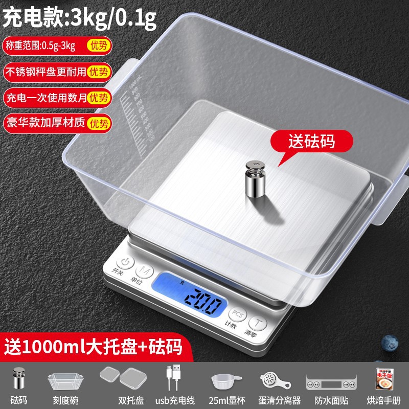 • [업그레이드 및 확대] 충전식 3kg/0.1g 더블트레이 + 계량컵 + 방수스티커 + USB 데이터케이블
