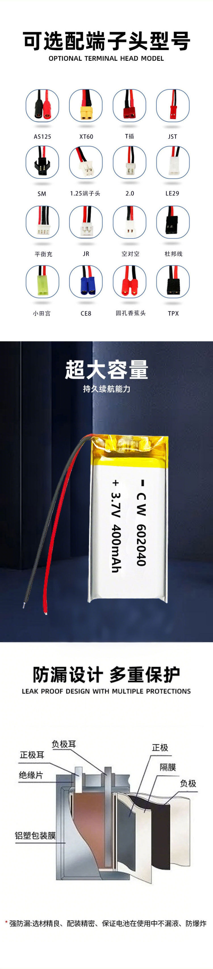 폴리머 리튬 배터리 602040 리튬 배터리 3.7V 450MHA 용량 전기 장난감 디지털 미용 기기스토어 가기