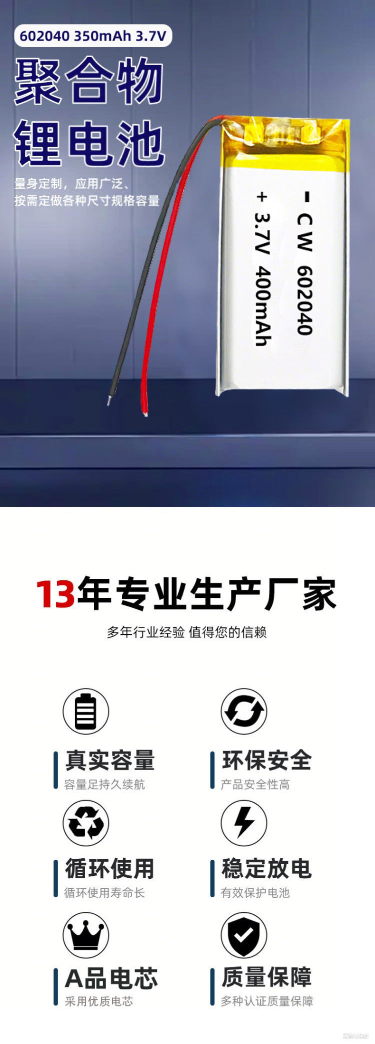 폴리머 리튬 배터리 602040 리튬 배터리 3.7V 450MHA 용량 전기 장난감 디지털 미용 기기