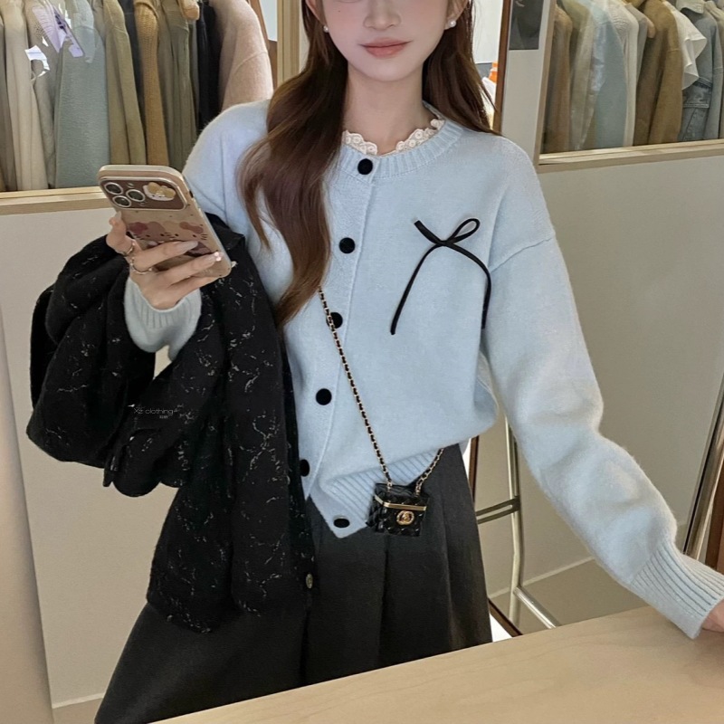 여성을위한 프랑스 복고풍 게으른 스타일 레이스 스플 라이스 스웨터 가을, 겨울 부드럽고 왁시 한 서양식 라운드 넥 버튼 스웨터