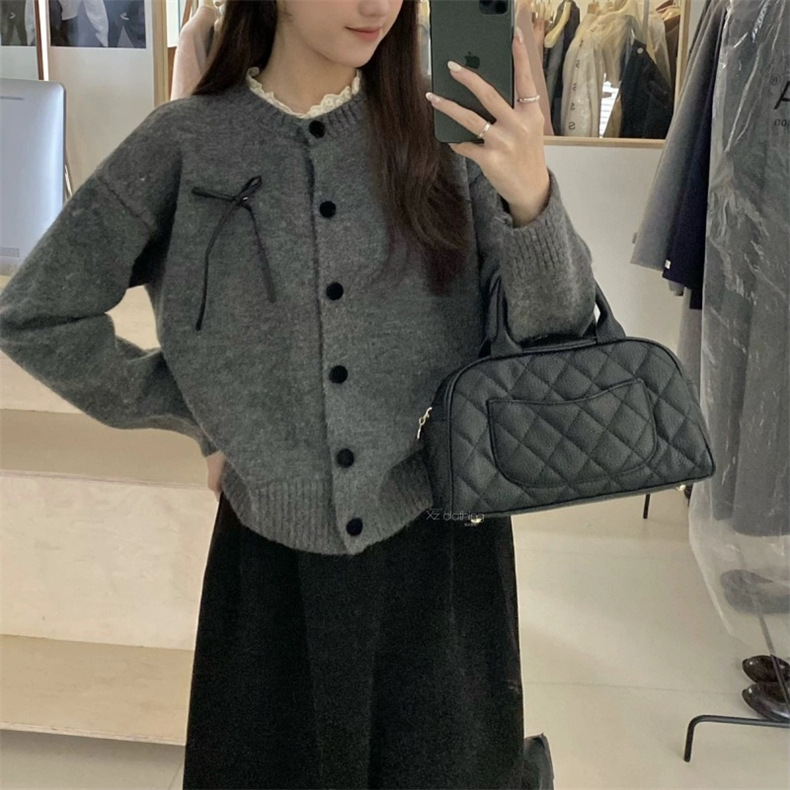 여성을위한 프랑스 복고풍 게으른 스타일 레이스 스플 라이스 스웨터 가을, 겨울 부드럽고 왁시 한 서양식 라운드 넥 버튼 스웨터스토어 가기