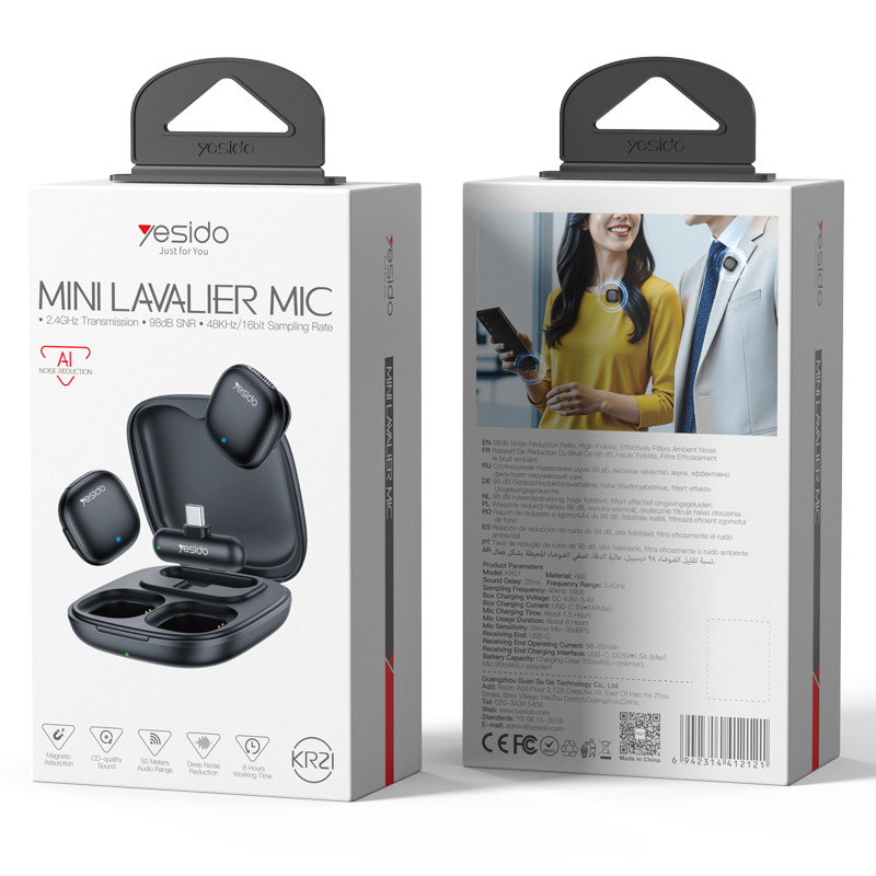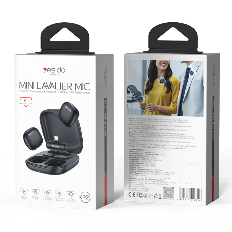 Yesido 무선 라발리에 마이크 AI 소음 감소 야외 라이브 녹화 비디오 휴대 전화 라발리에 마이크 1-2