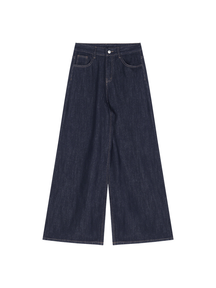 여름 여성을 위한 미국 복고풍 진한 파란색 청바지 홍콩 스타일 루즈한 와이드 팬츠 여성용 캐주얼 스트레이트 바닥 길이 바지