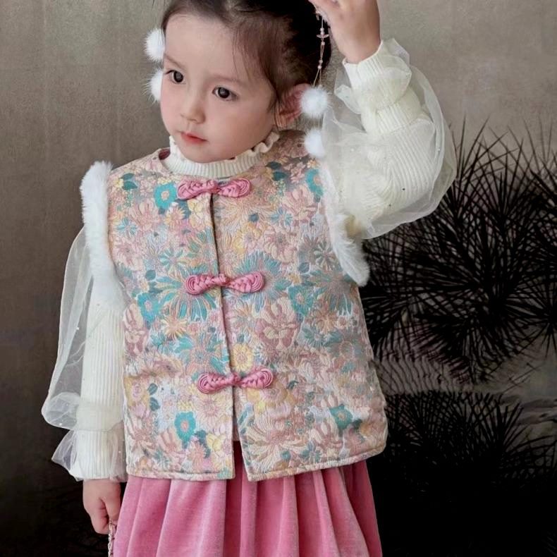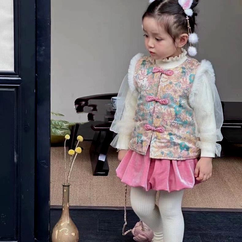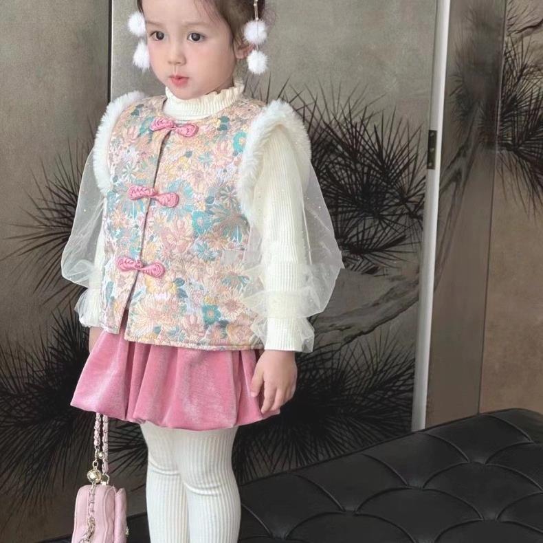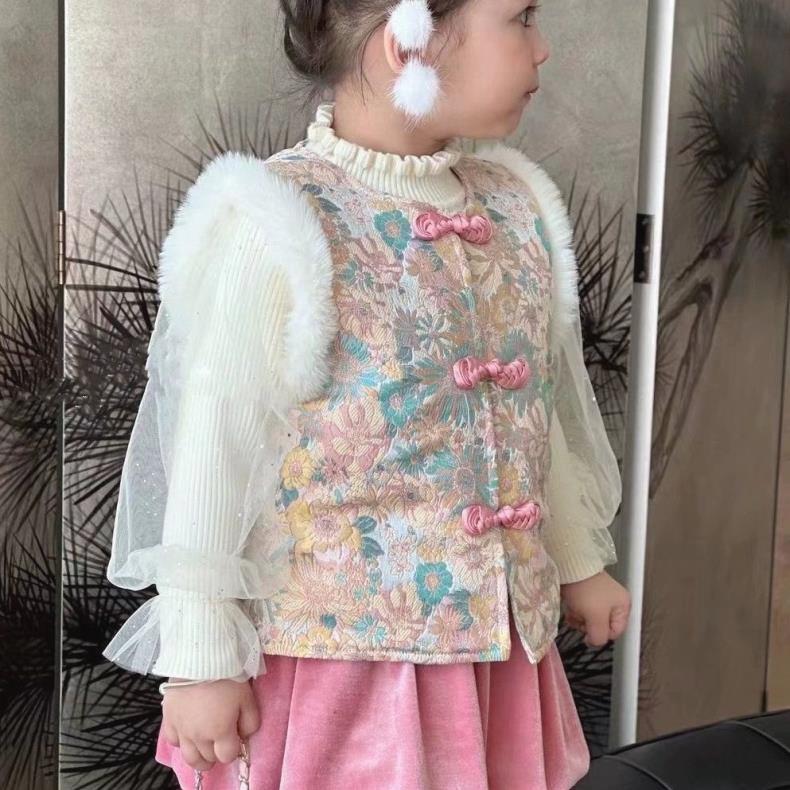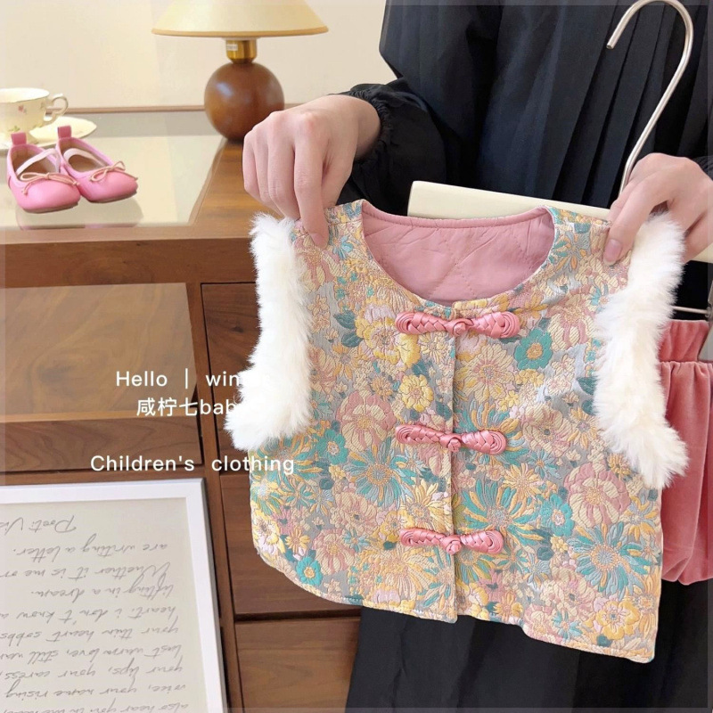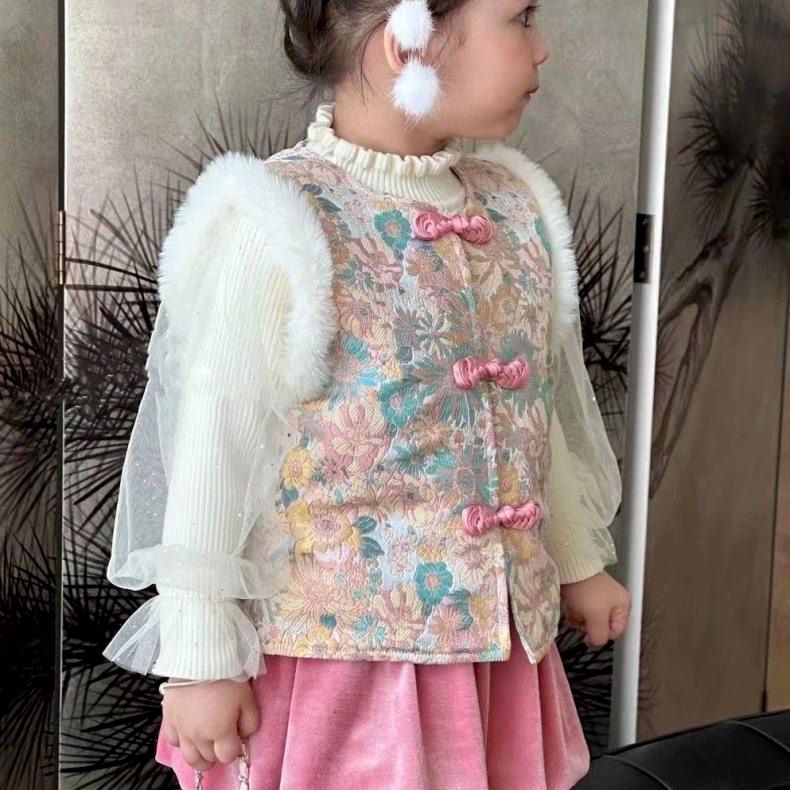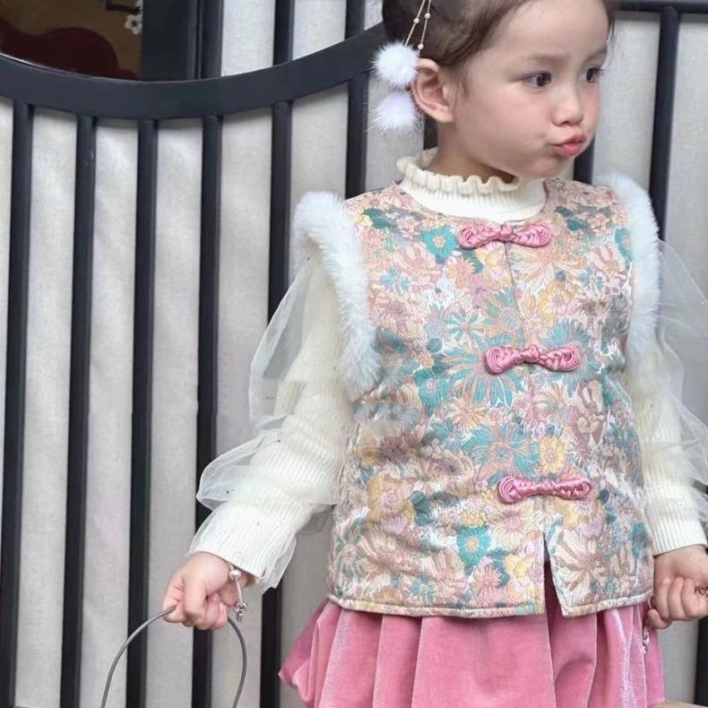 여자 아기 토끼 모피 소매 수제 버클 입체 자수 퀼트 치파오 조끼 어린이 새해 조끼 가을, 겨울