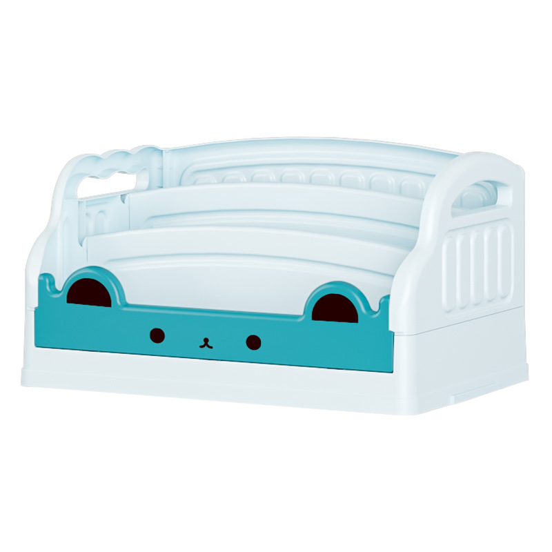 • 파란색 데스크탑 선반에 책장을 놓으세요