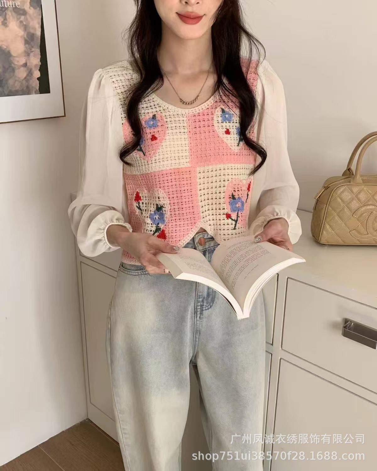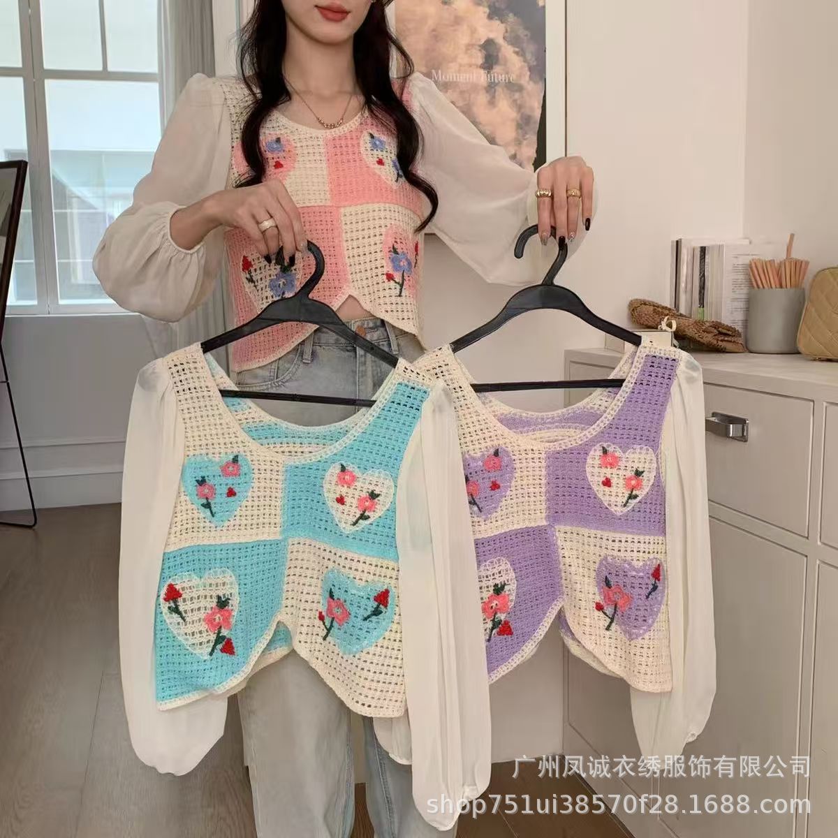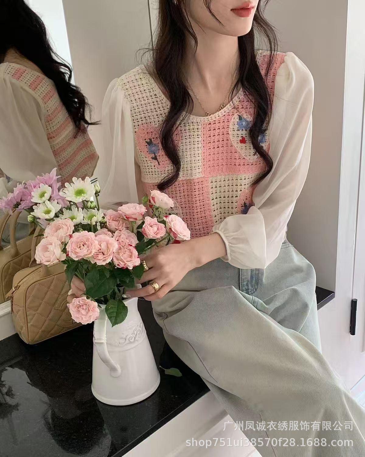 달콤하고 시크하며 서양식 니트 크로셰 스플라이싱 긴팔 여성 신작 봄 여름 투피스 쉬폰 셔츠 탑스토어 가기
