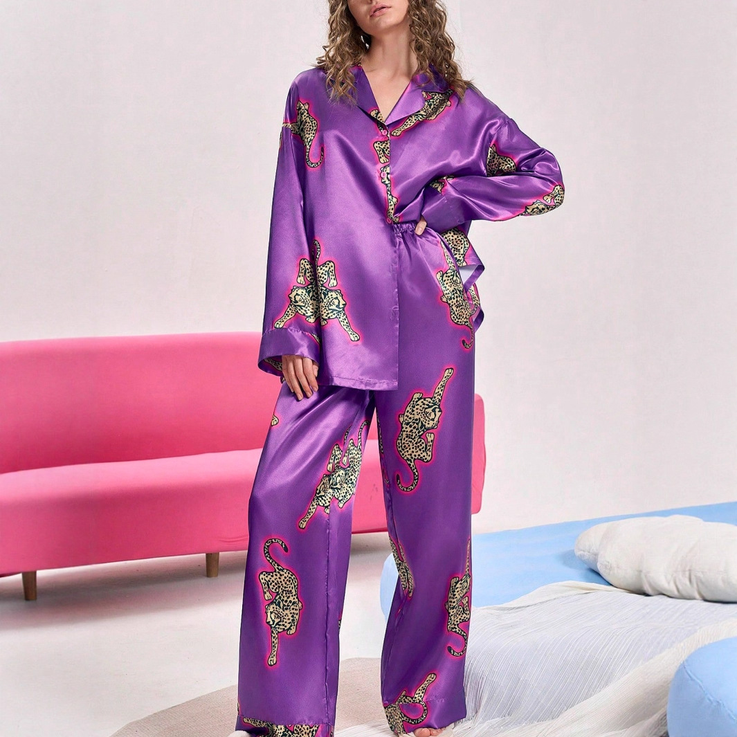 유럽과 미국의 국경 간 2025 가을 AliExpress Amazon 새로운 럭셔리 레오파드 하이 엔드 시뮬레이션 실크 홈웨어 세트