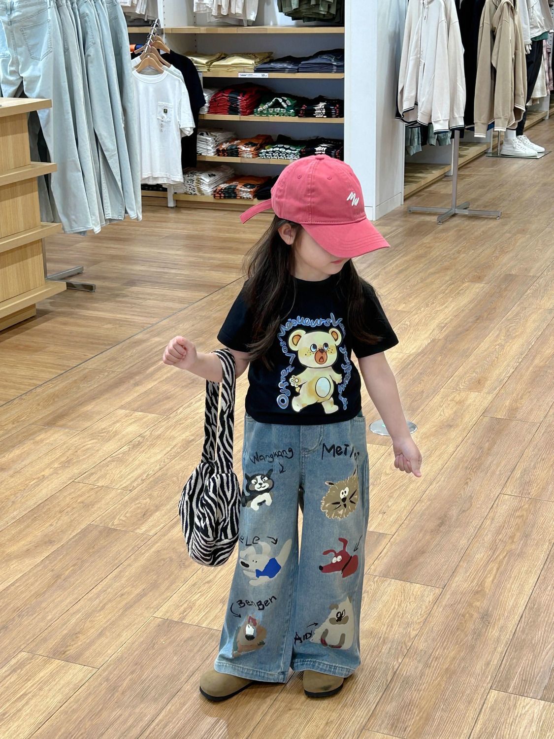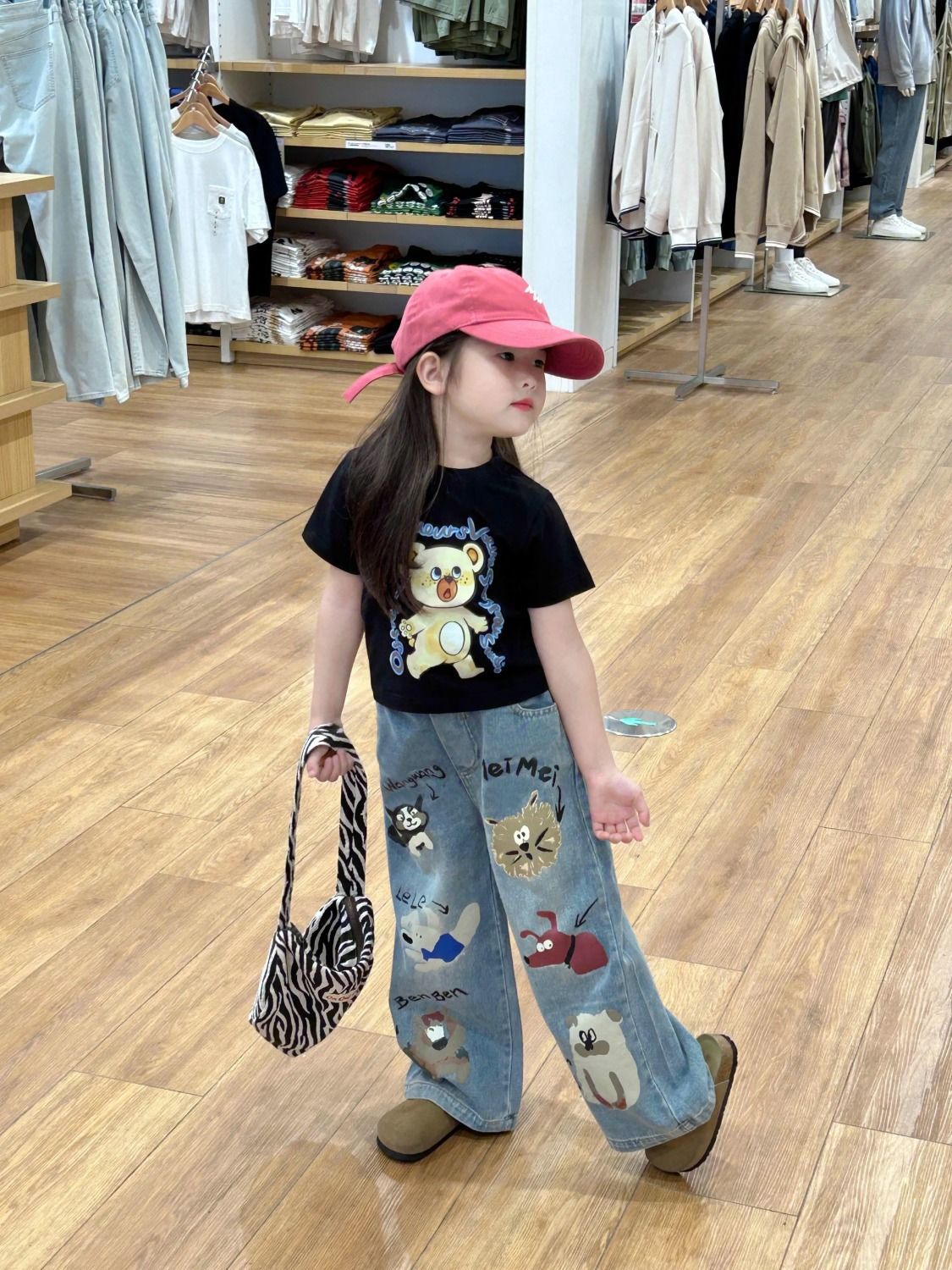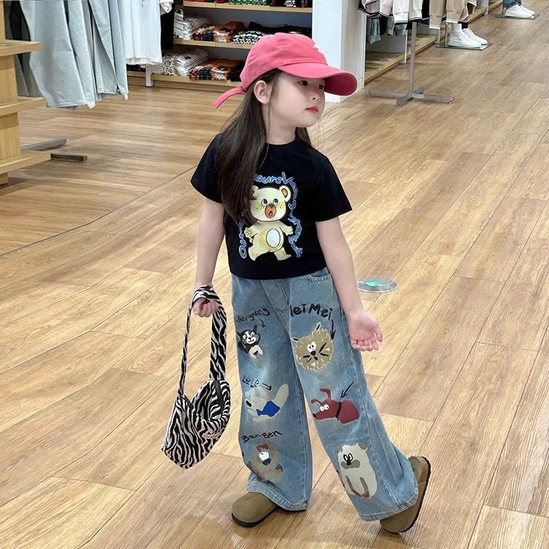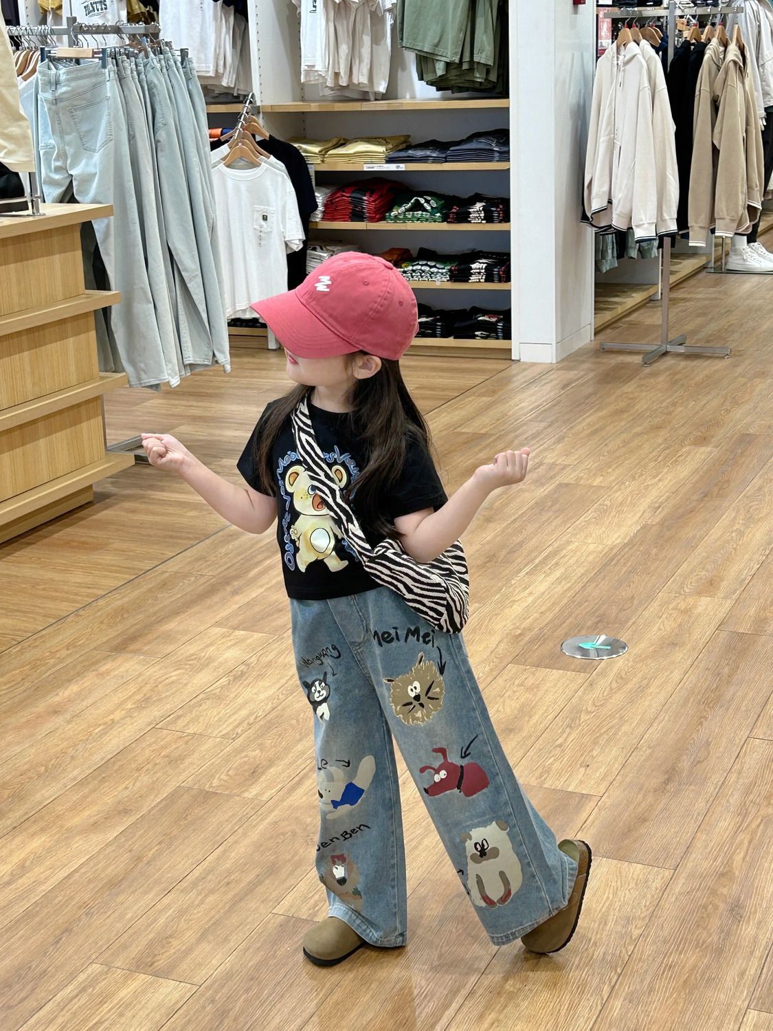 여자 프린트 청바지 여름 착용 2025 새로운 한국 스타일 유행 어린이 얇은 바지 여자 아기 여름 스트레이트 바지스토어 가기