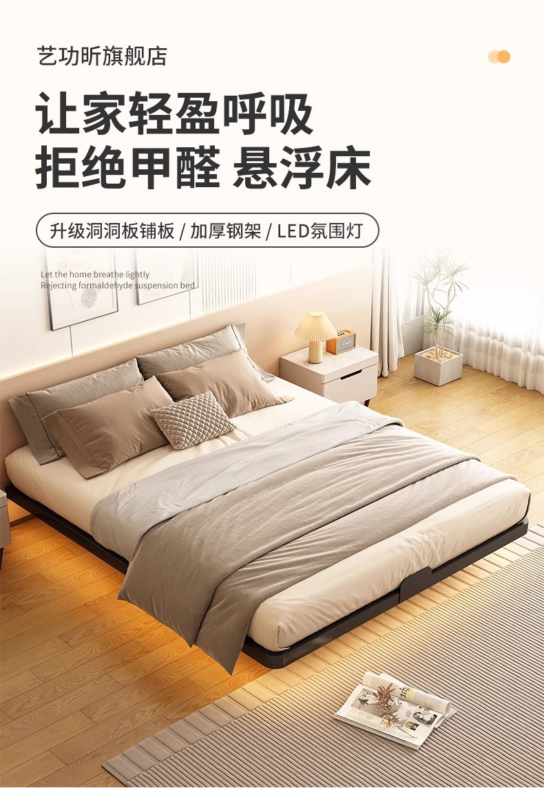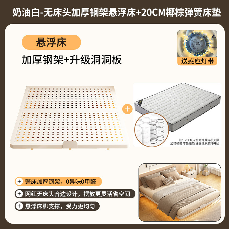 • 탄소강 프레임 침대 + 스마트 센서 라이트 스트립 + 20CM 코코넛 야자 매트리스 [크림 화이트]