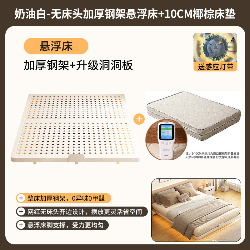 • 탄소강 프레임 침대 + 스마트 센서 라이트 스트립 + 10CM 코코넛 야자 매트리스 [크림 화이트]