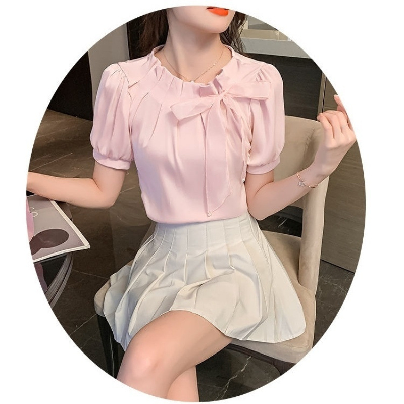 프렌치 시크 보우 반팔 쉬폰 셔츠 여름 여성 디자인 틈새 상의, 패셔너블하고 아름다운 셔츠스토어 가기