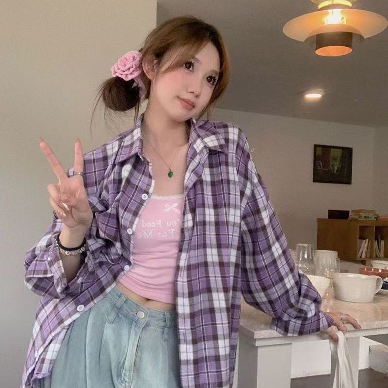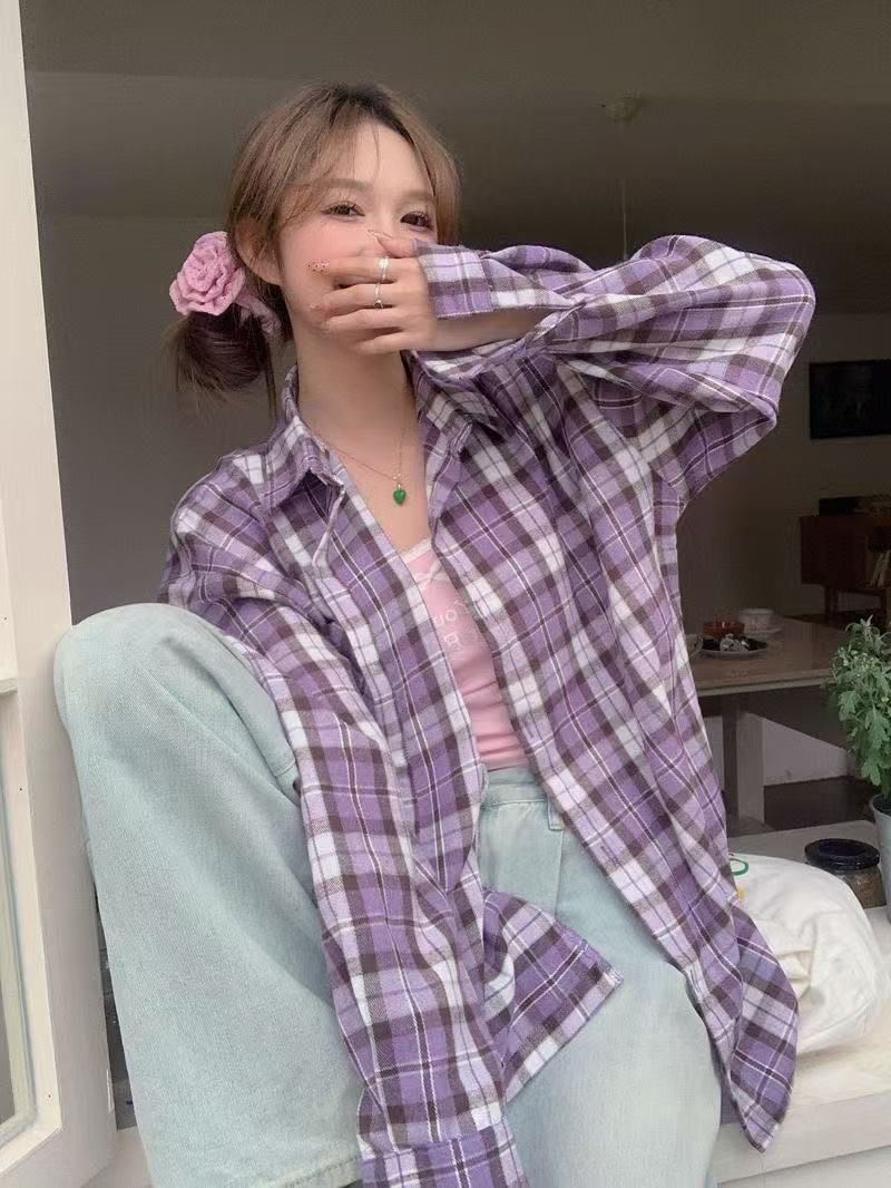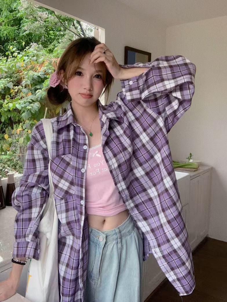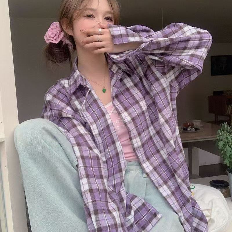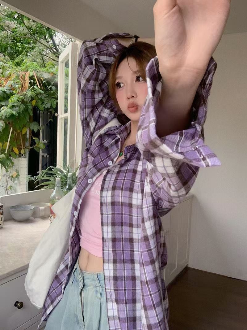 아메리칸 체크 무늬 복고풍 캐주얼 셔츠 여름 자외선 차단 의류 여성 타로 퍼플 루즈 트렌디 게으른 스타일 셔츠 재킷스토어 가기