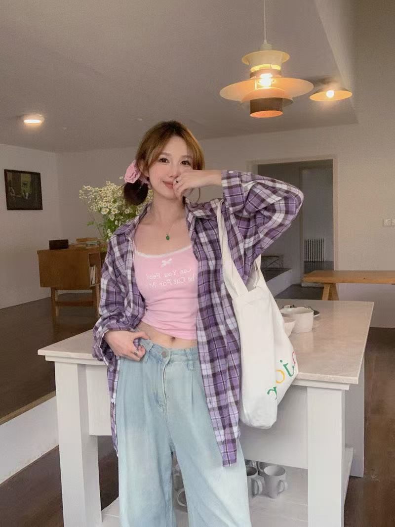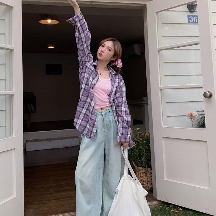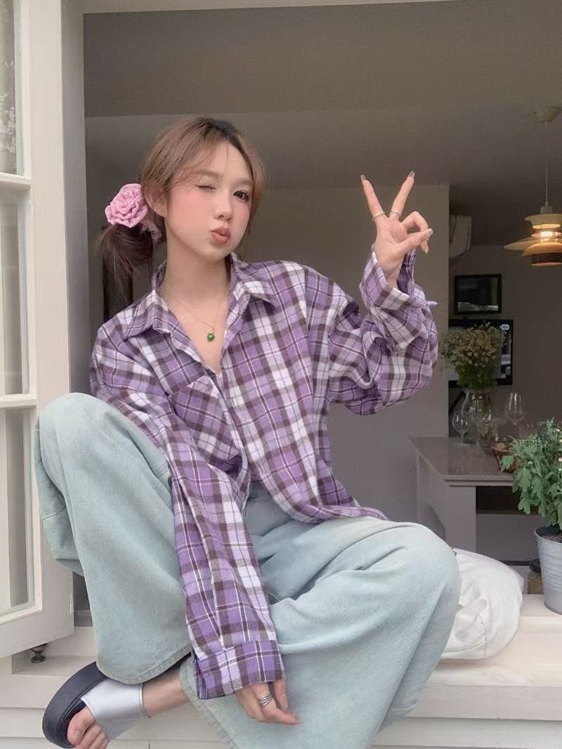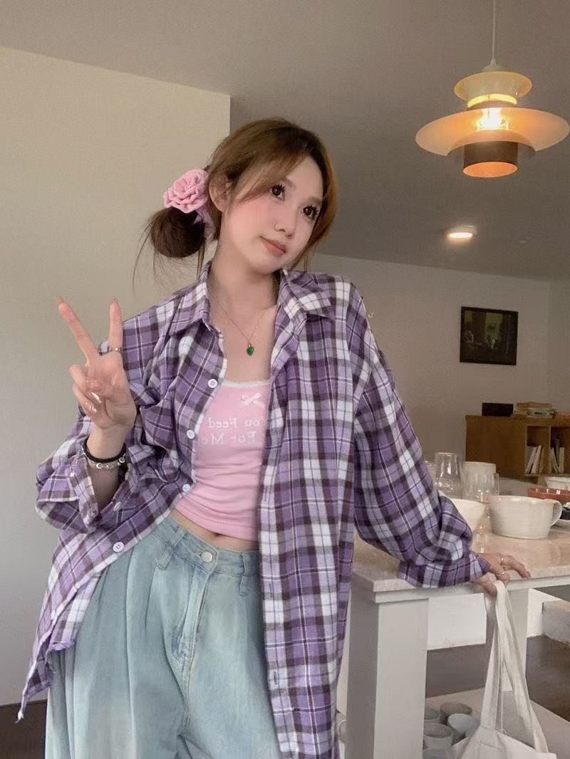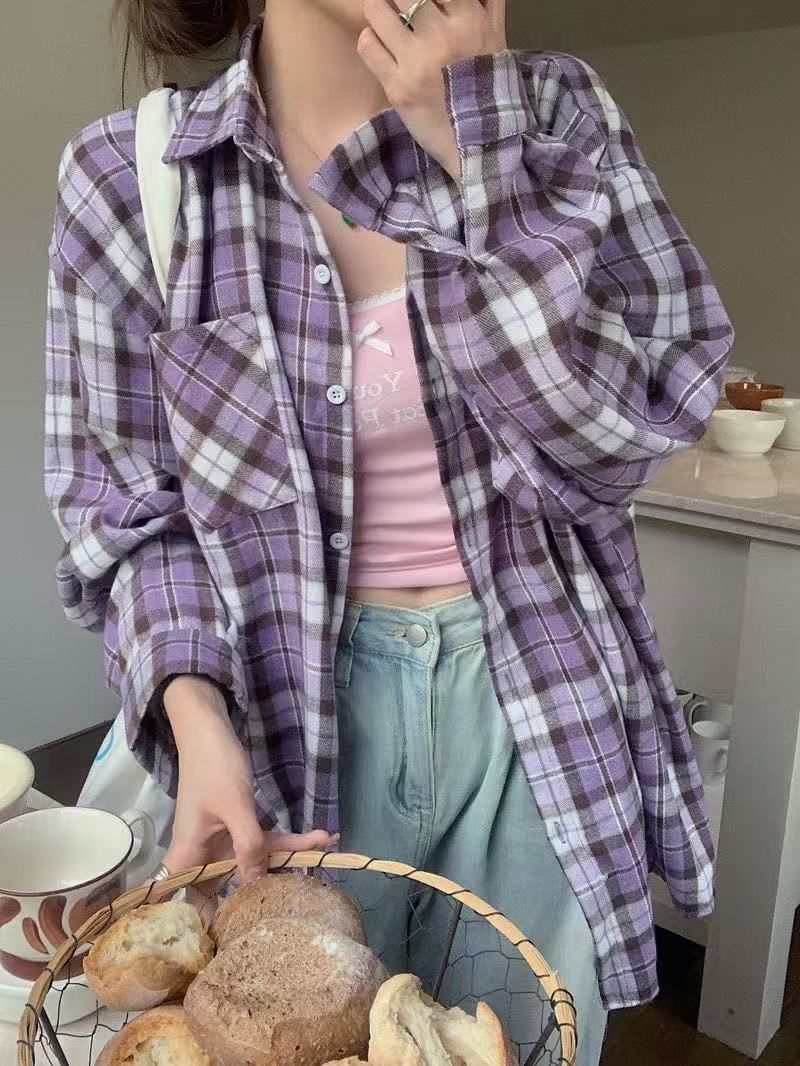 아메리칸 체크 무늬 복고풍 캐주얼 셔츠 여름 자외선 차단 의류 여성 타로 퍼플 루즈 트렌디 게으른 스타일 셔츠 재킷스토어 가기