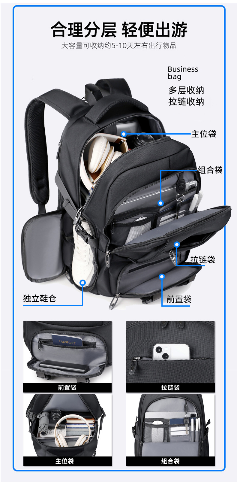국경 간 확장 대용량 배낭 야외 여행 배낭 캐주얼 가방 신발 찬장을 갖춘 다기능 야외 수하물 가방스토어 가기