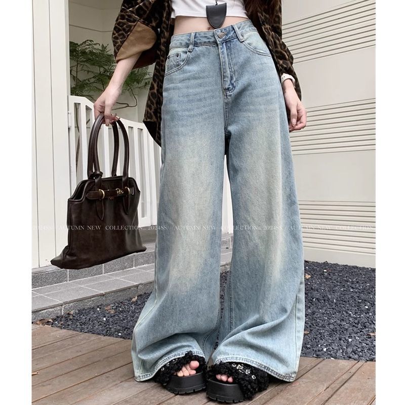 가을 핫걸을 위한 하이 스트리트 하이웨이스트 슬리밍 바닥 길이 팬츠, 여성용 다용도 디자인 워싱 와이드 레그 레트로 청바지, 새로운 스타일