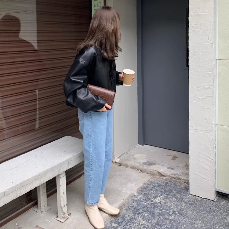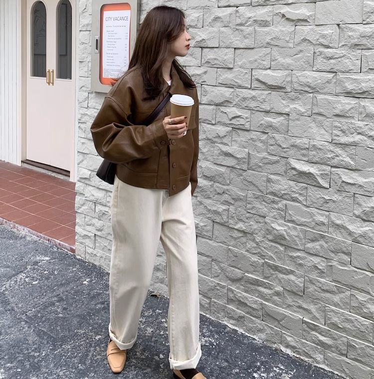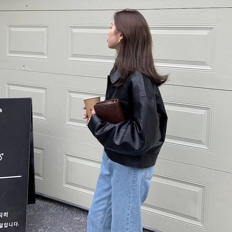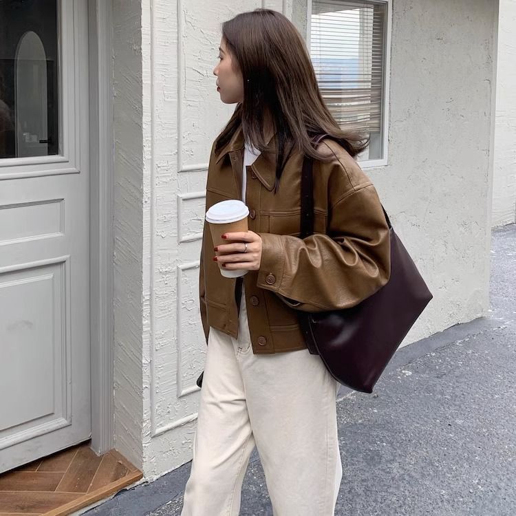 여성을위한 유럽 갈색 가죽 자켓 2025 봄과 가을 새로운 복고풍 인기 pu 가죽 짧은 자켓 작은 사람들을위한스토어 가기
