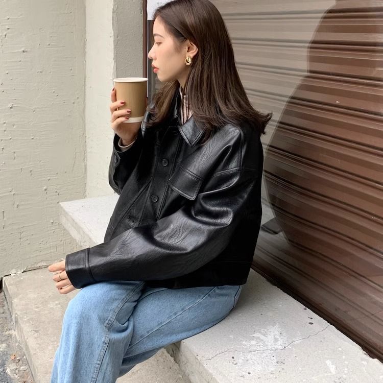 여성을위한 유럽 갈색 가죽 자켓 2025 봄과 가을 새로운 복고풍 인기 pu 가죽 짧은 자켓 작은 사람들을위한