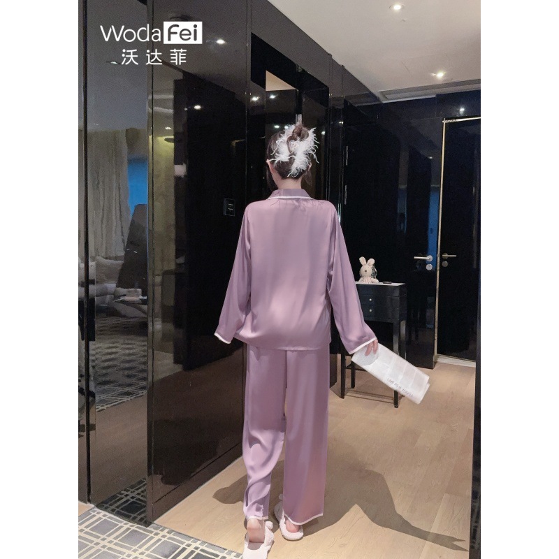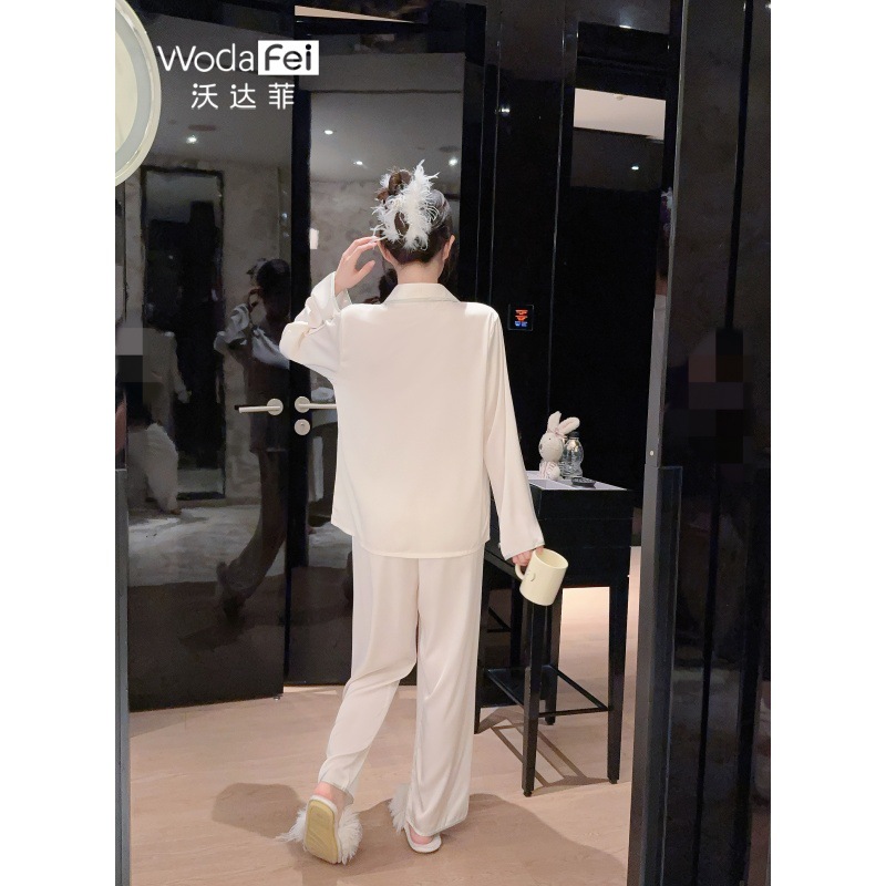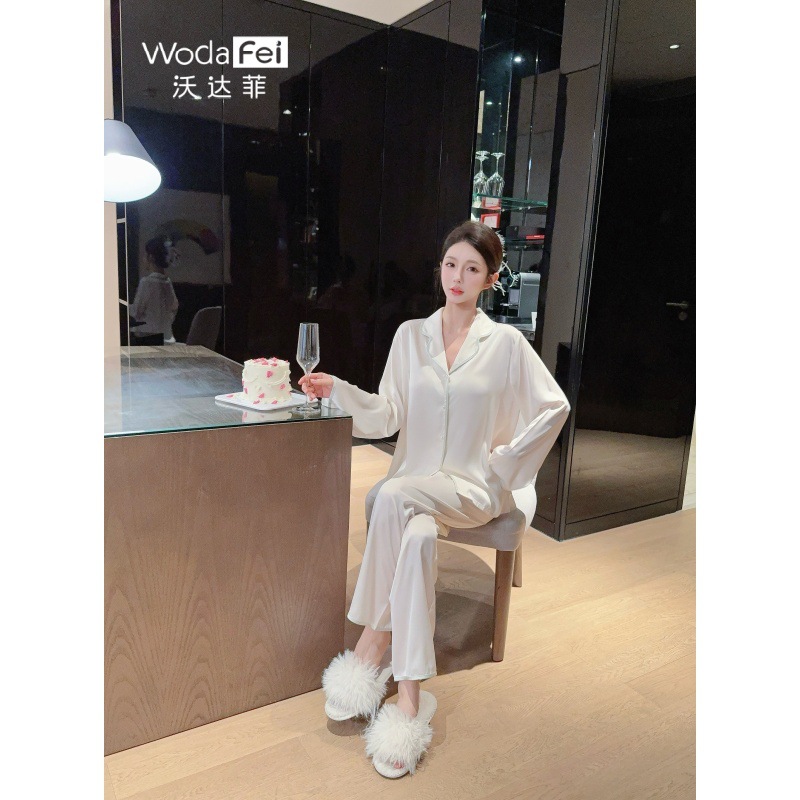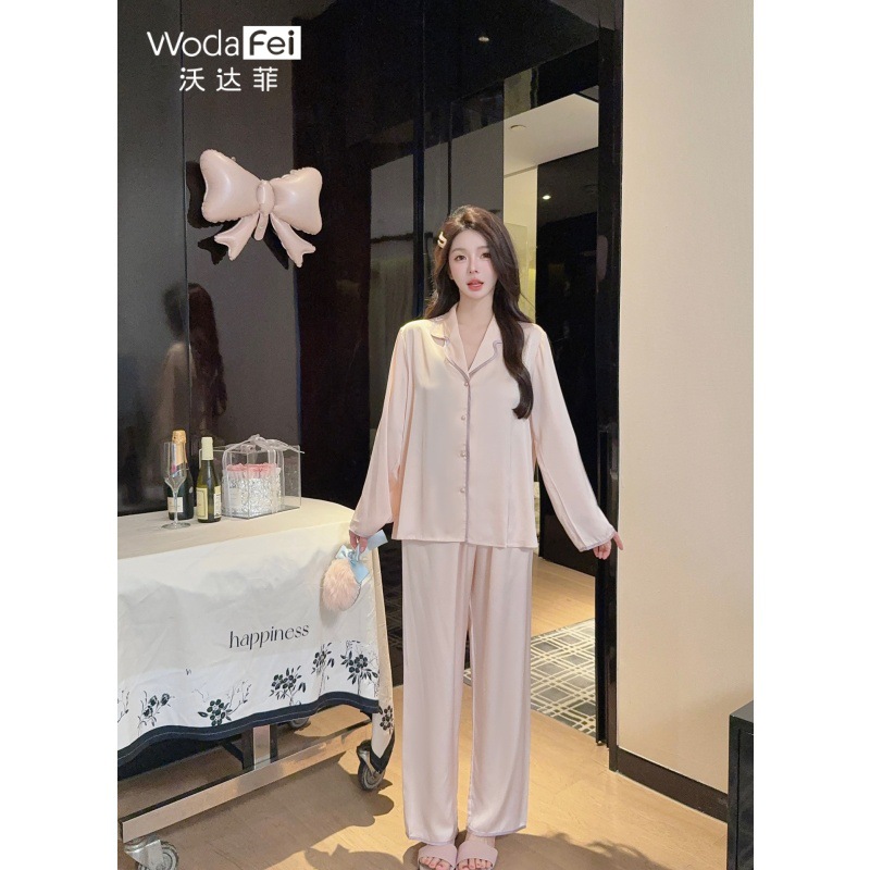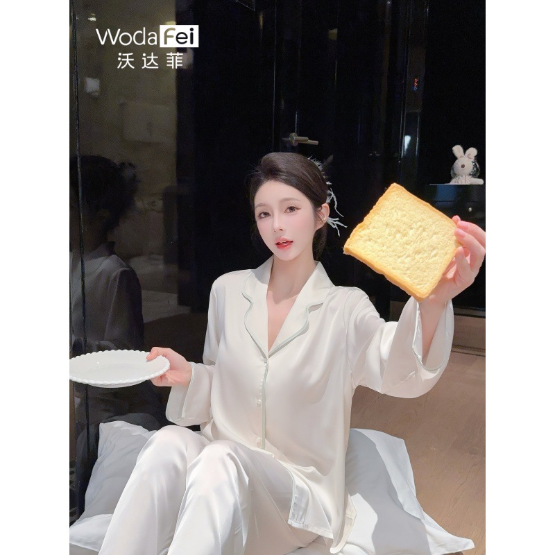 여성을위한 캐주얼 간단한 얇은 얼음 실크 잠옷 봄과 가을 새로운 새틴 홈웨어 세트 요정 스타일 달콤한 잠옷 가을