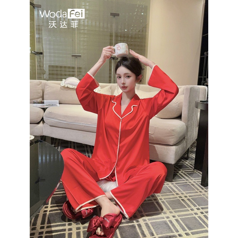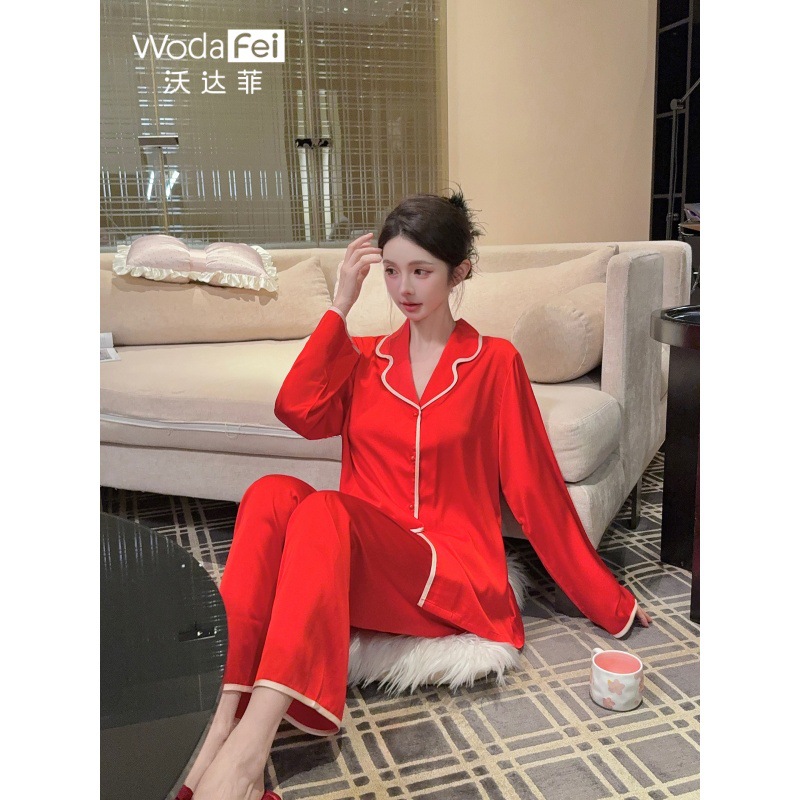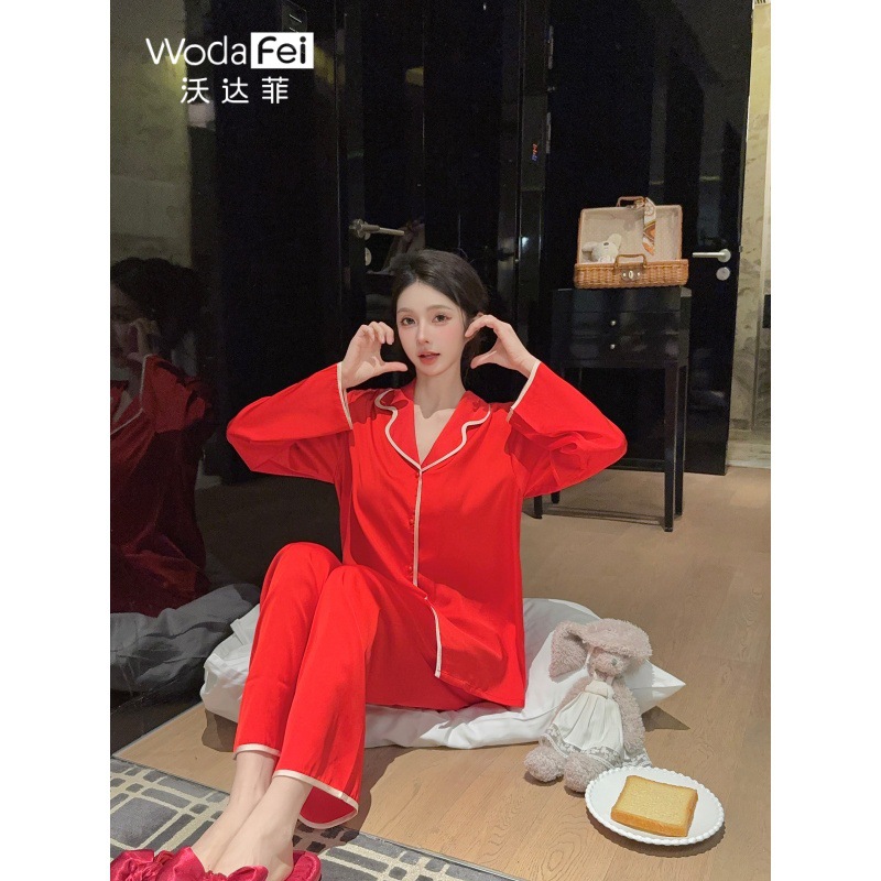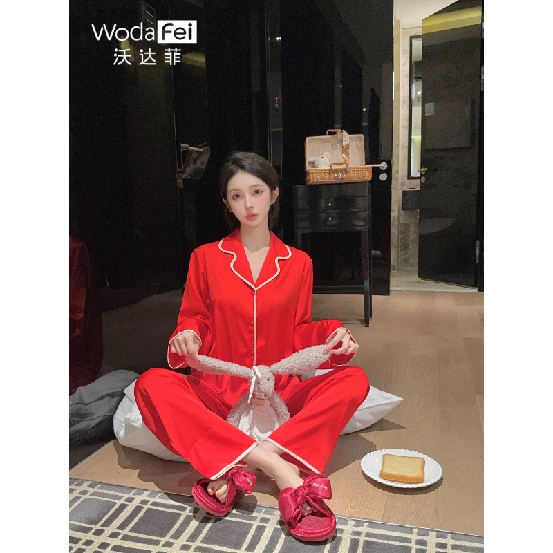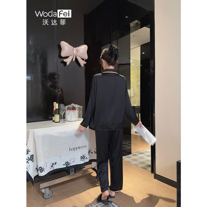 여성을위한 캐주얼 간단한 얇은 얼음 실크 잠옷 봄과 가을 새로운 새틴 홈웨어 세트 요정 스타일 달콤한 잠옷 가을