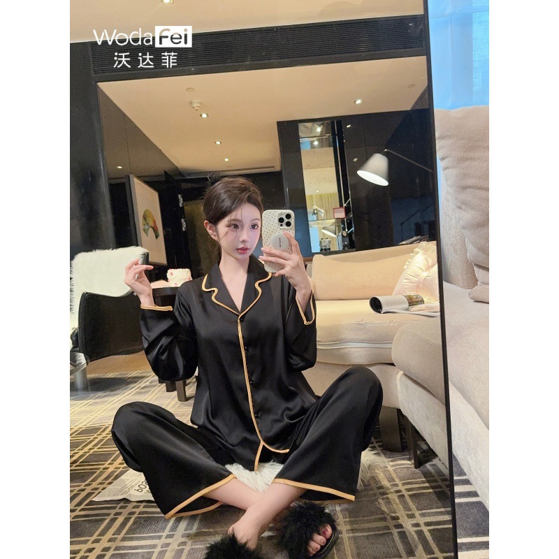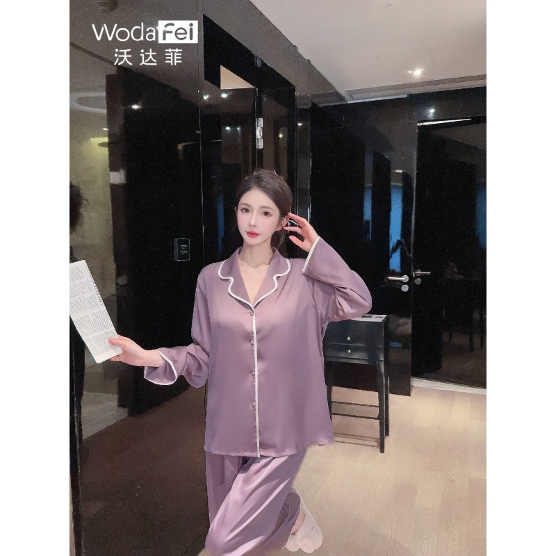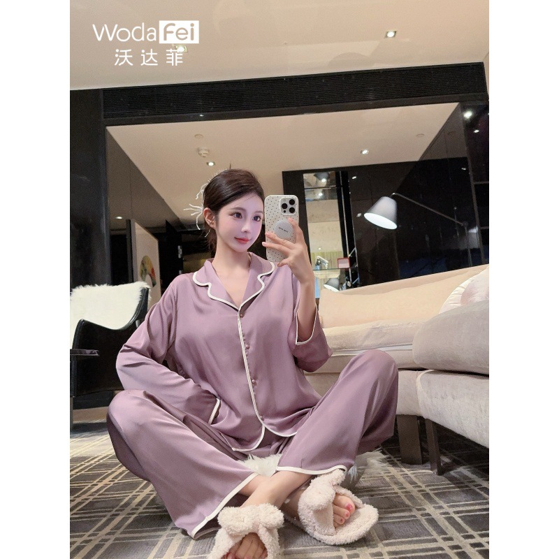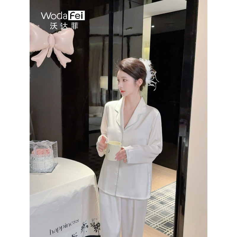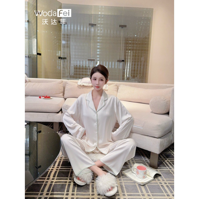 여성을위한 캐주얼 간단한 얇은 얼음 실크 잠옷 봄과 가을 새로운 새틴 홈웨어 세트 요정 스타일 달콤한 잠옷 가을스토어 가기