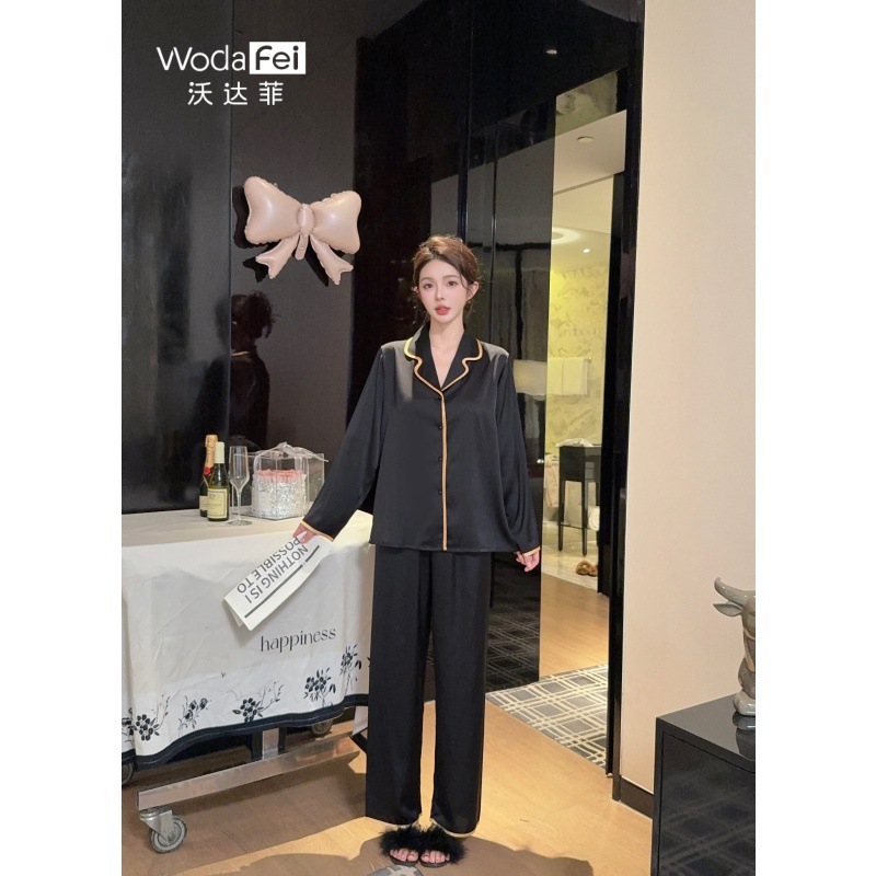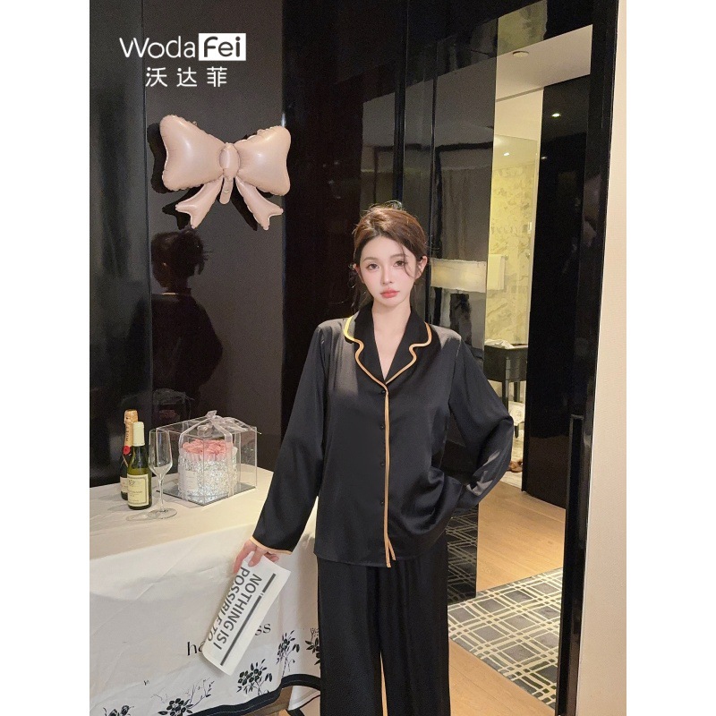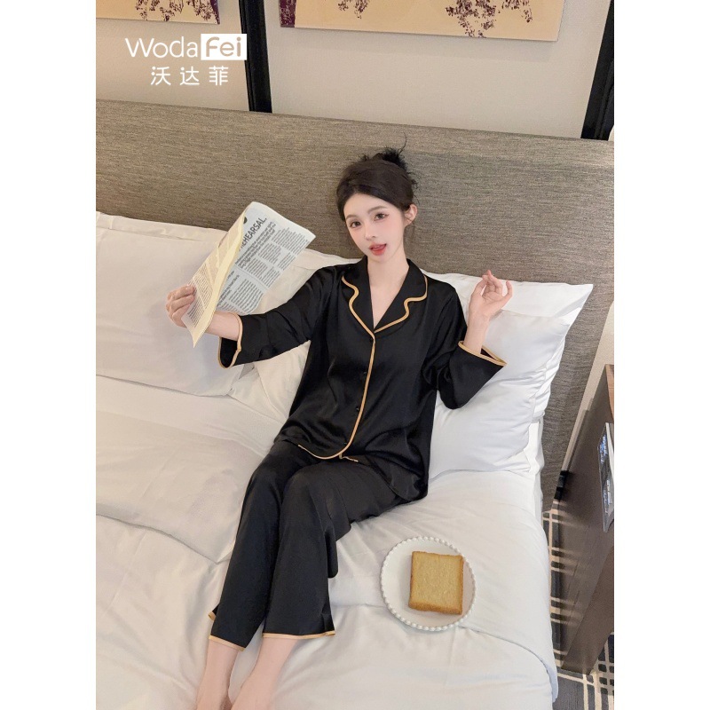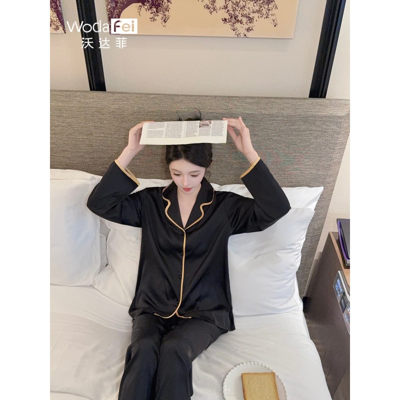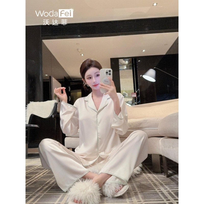 여성을위한 캐주얼 간단한 얇은 얼음 실크 잠옷 봄과 가을 새로운 새틴 홈웨어 세트 요정 스타일 달콤한 잠옷 가을스토어 가기