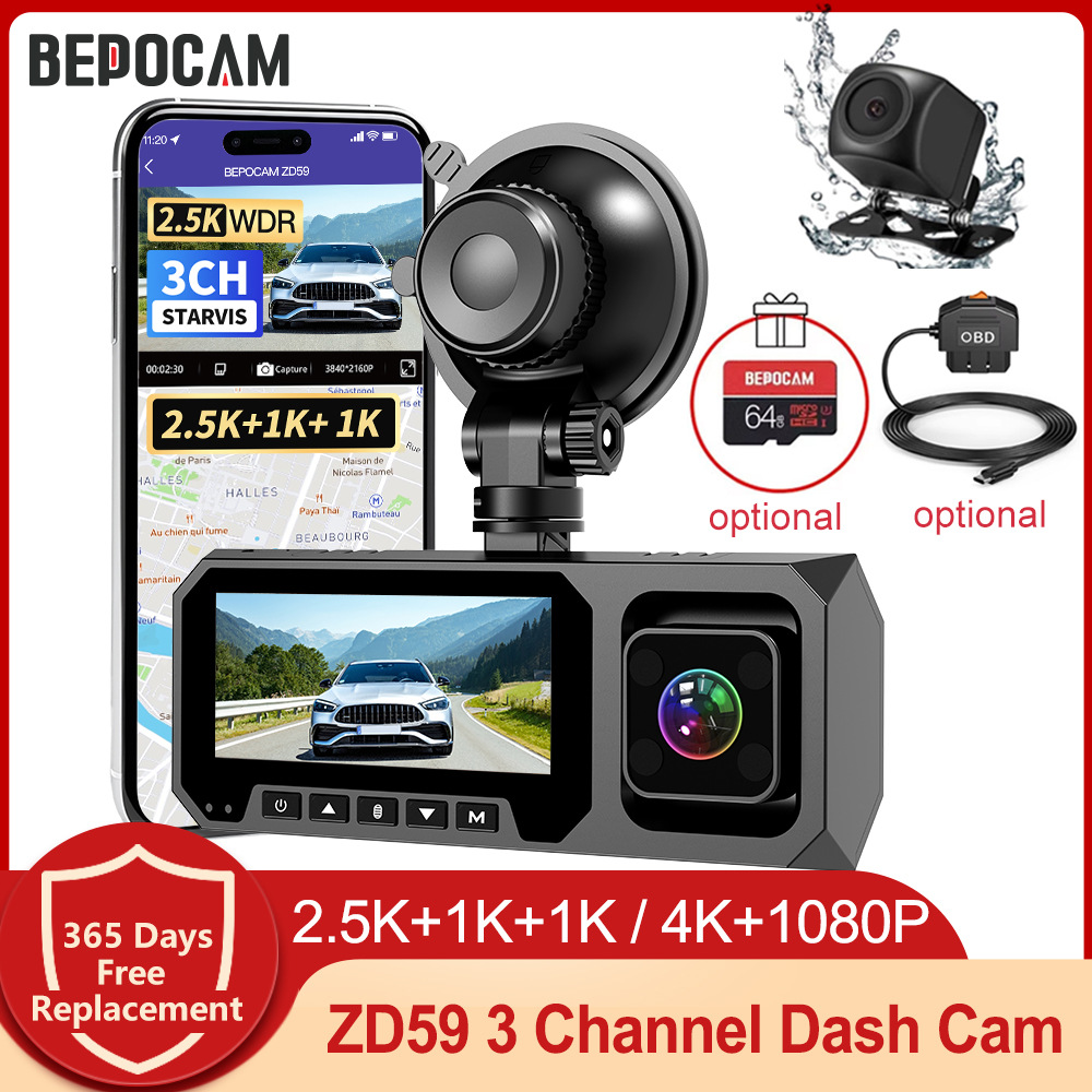 BEPOCAM 3 Channel Car DVR ZD59 UHD 2K 3-Lens Inside Vehicle Dash Cam Three Way Camera DVRs Recorder Video GPS Dashcam Camcorde