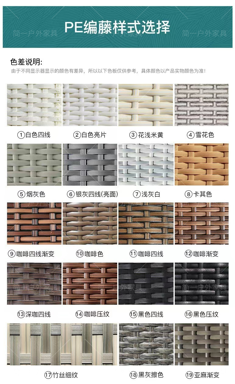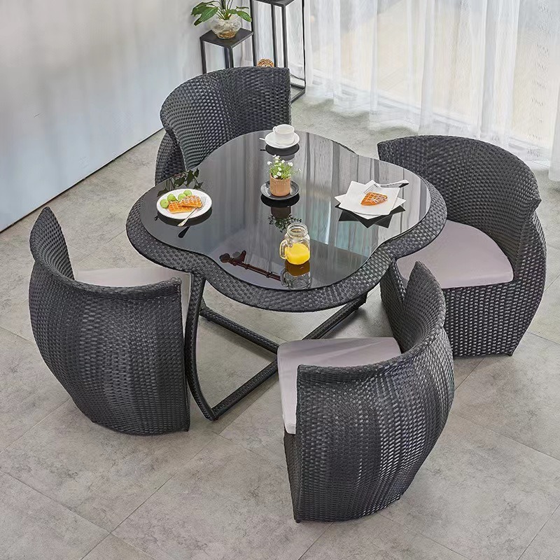 테이블과 의자, 등나무로 엮은 야외용 방수 및 자외선 차단 철제 락보드 식탁, 유리 등나무 의자 조합 가구, 심플하고 모던한 스타일