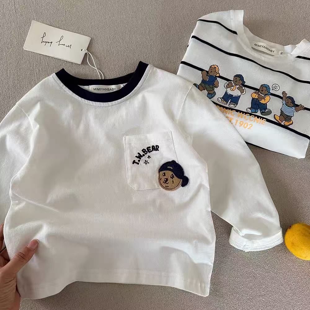 어린이 곰 티셔츠 긴 소매 2025 봄, 가을 새로운 스타일 소년과 소녀 포켓 탑 베이비 스트라이프 바닥 셔츠 유행스토어 가기
