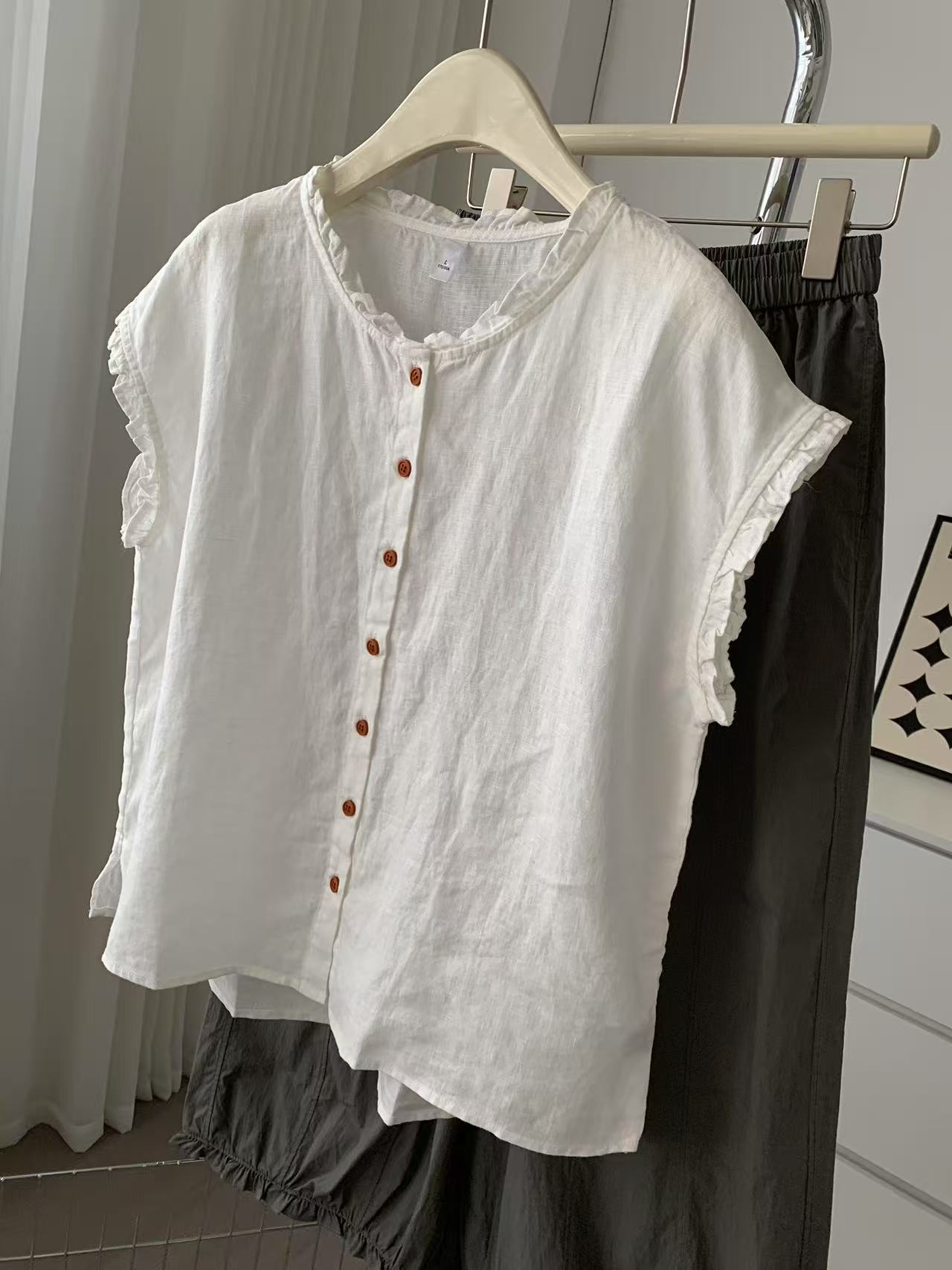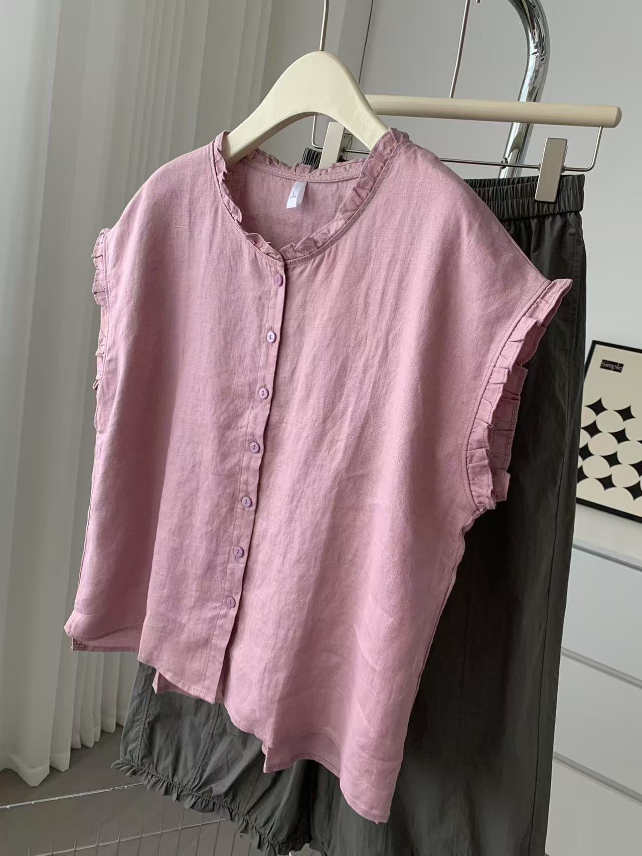 퓨어 린넨 2025 여름 셔츠 민소매 여성 버진 컬러 루즈 캐주얼 한국 스타일 탑 새로운 탑 연령 감소스토어 가기