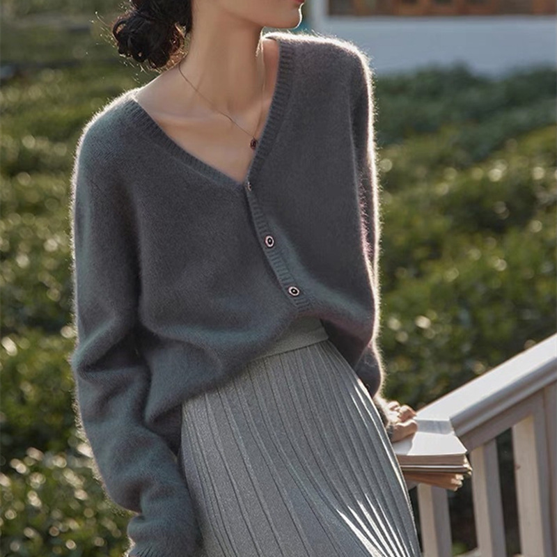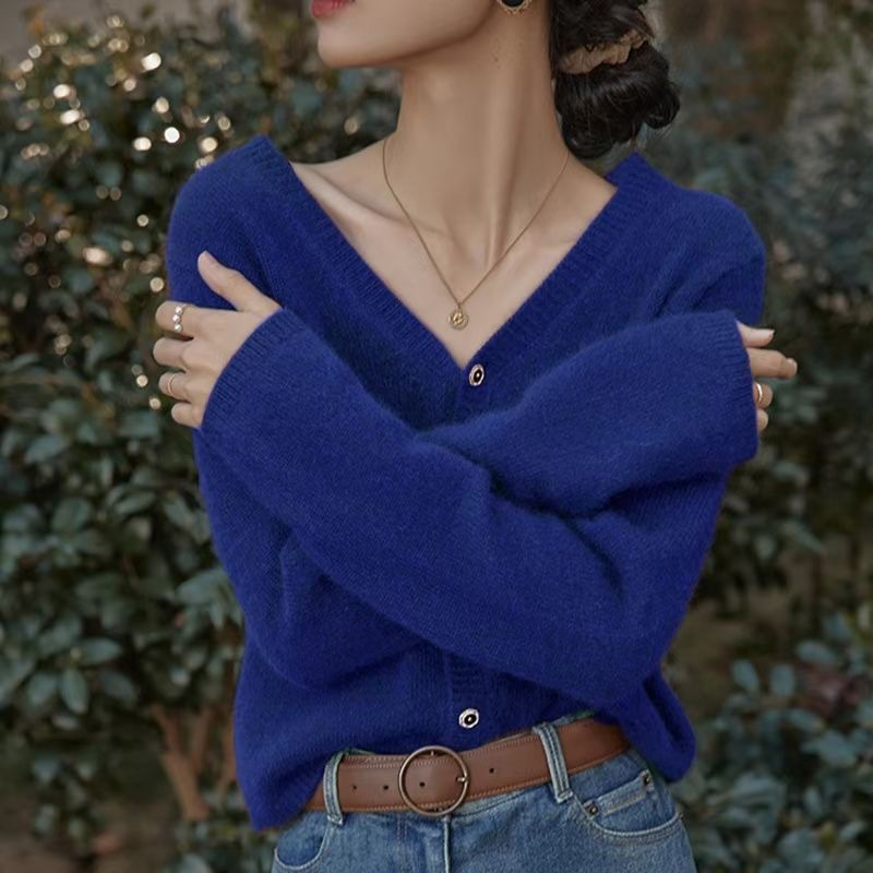 여성용 프렌치 스웨터, 복고풍 솔리드 컬러 브이넥 가을 새로운 스타일의 게으른 스타일의 루즈하고 부드러운 왁시 스웨터 재킷스토어 가기