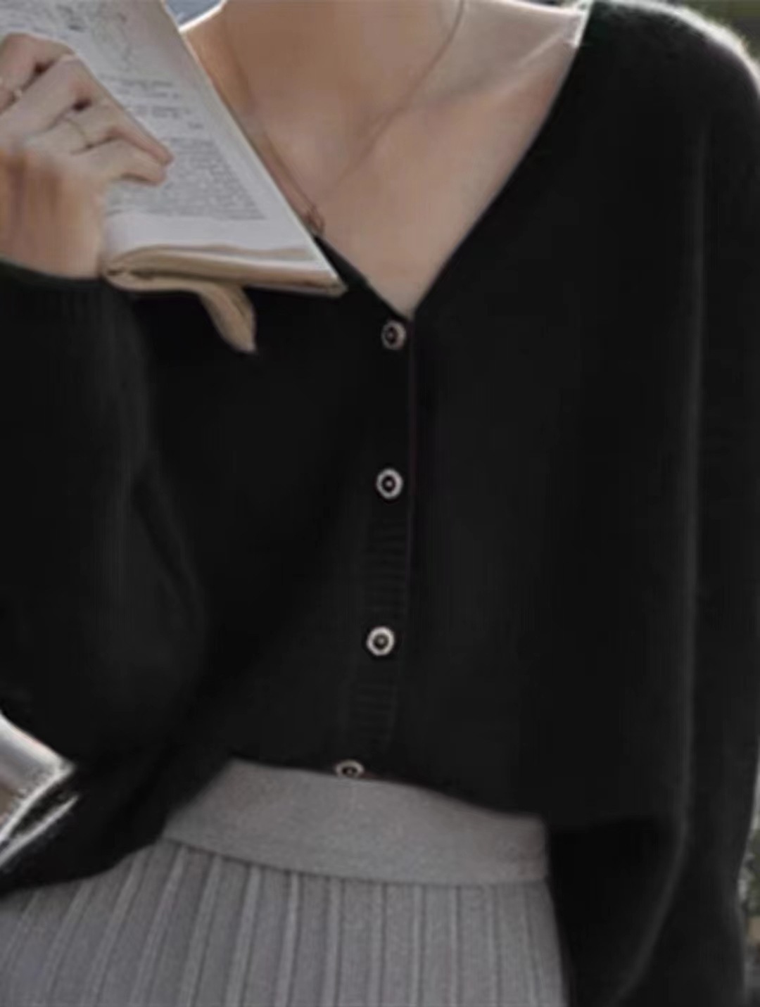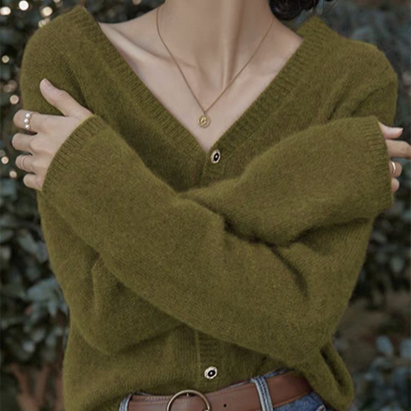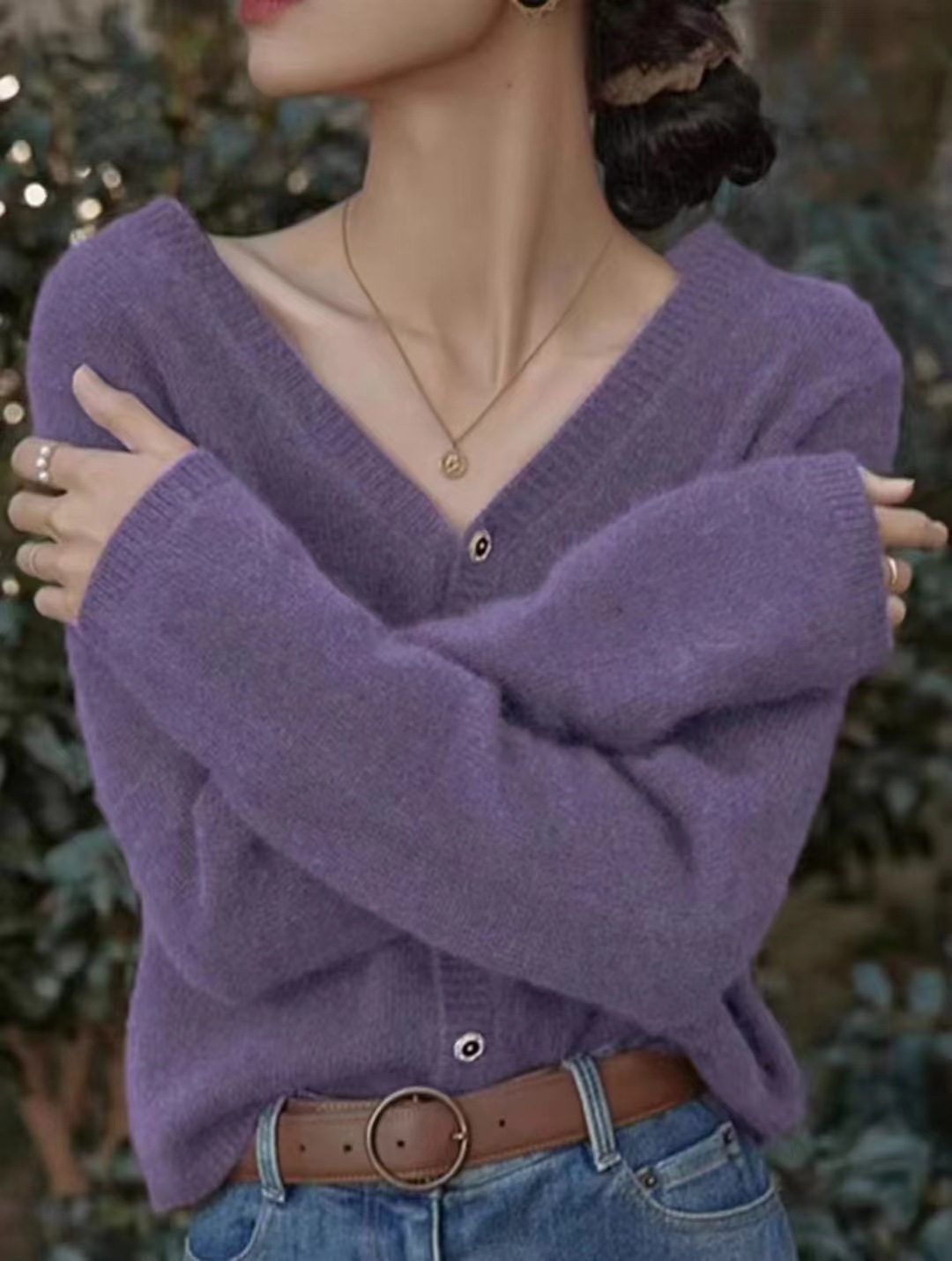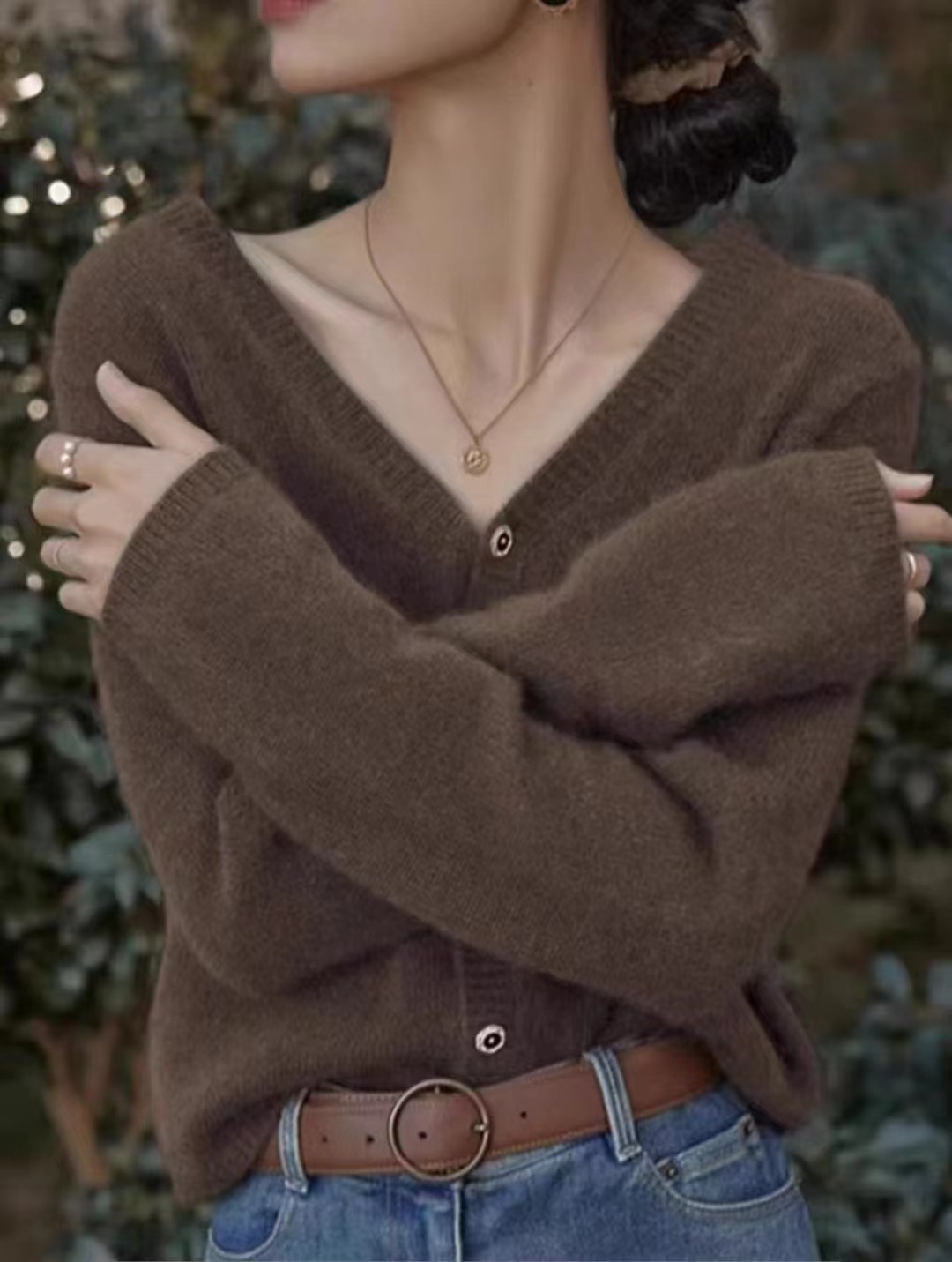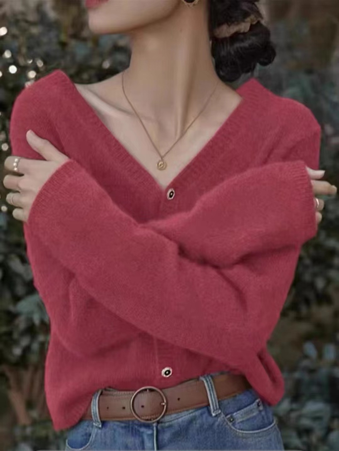 여성용 프렌치 스웨터, 복고풍 솔리드 컬러 브이넥 가을 새로운 스타일의 게으른 스타일의 루즈하고 부드러운 왁시 스웨터 재킷