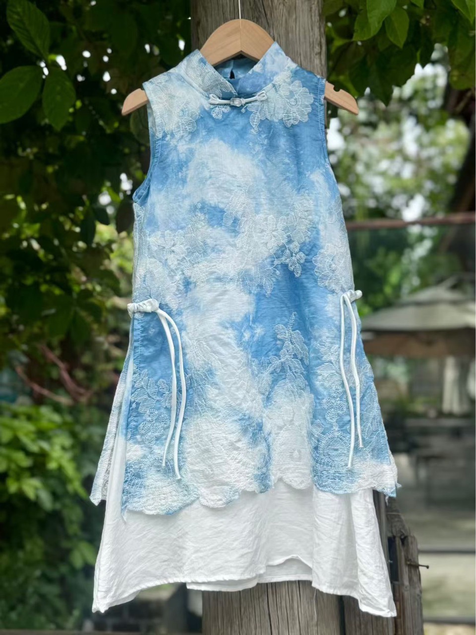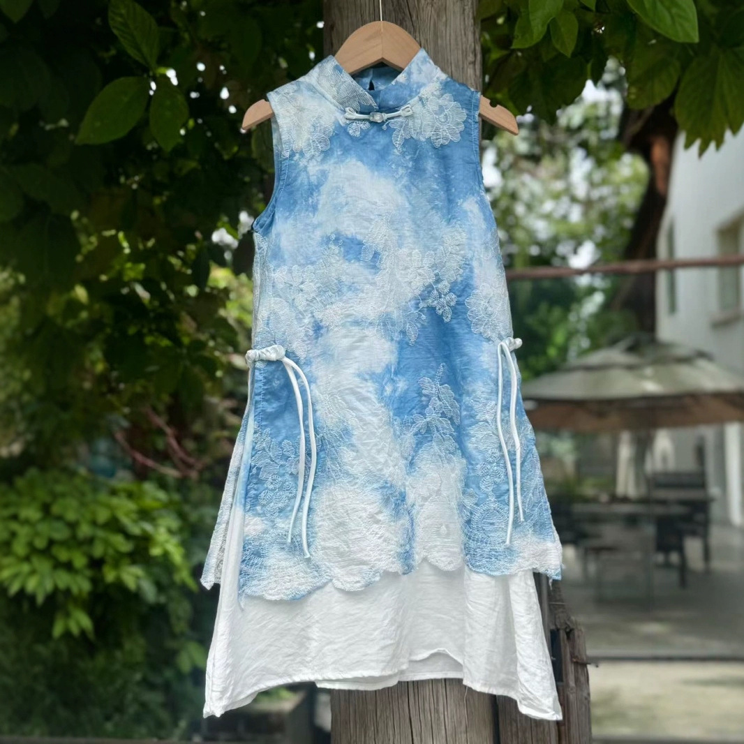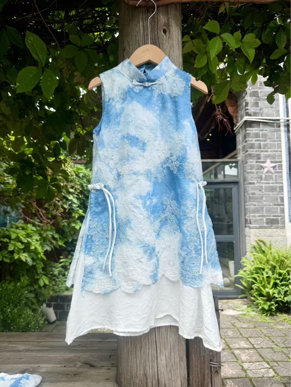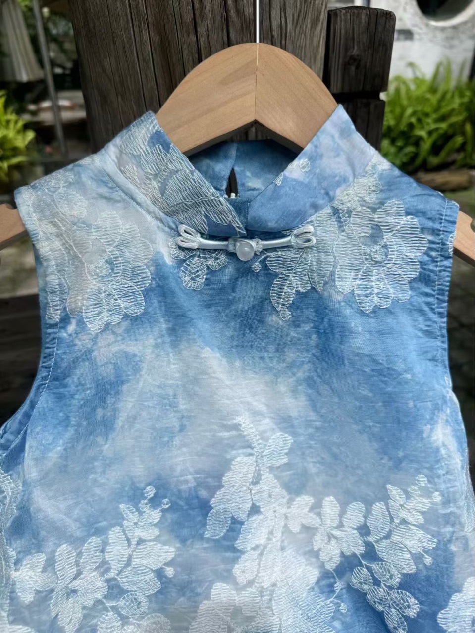 운남 다리 고대 방식으로 염색한 소녀의 민소매 치파오 드레스 여름 새로운 스타일 자수 파란색 염색 조끼 드레스