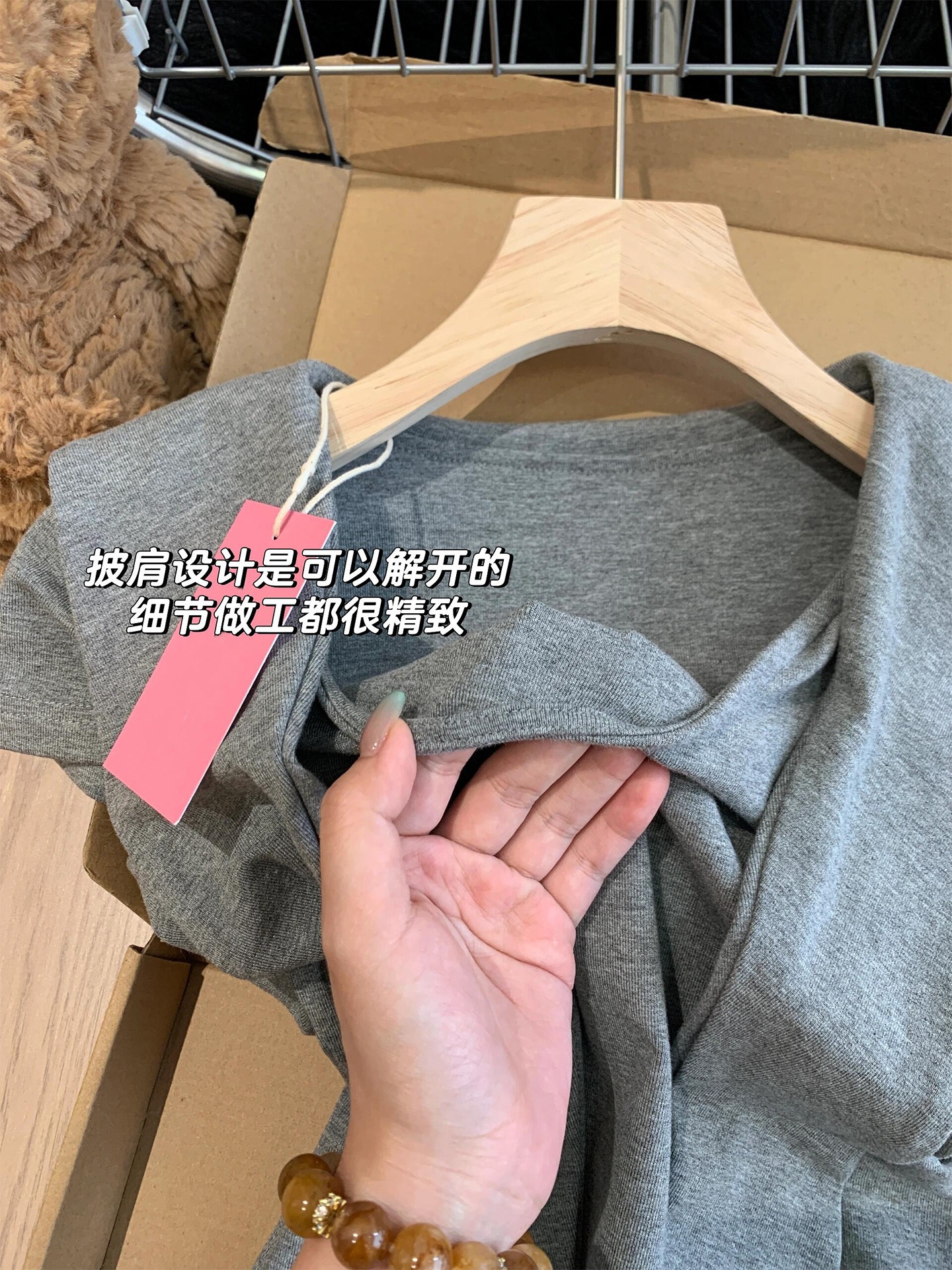 한국 가짜 투피스 그레이 숄 반팔 티셔츠 여성 2025 여름 디자인 세련된 슬림핏 오버숄더 탑스토어 가기