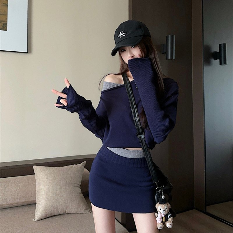 2025 봄 새로운 디자인 컬러 블록 배트 슬리브 니트 탑 캐주얼 다목적 짧은 스커트 정장 여성스토어 가기