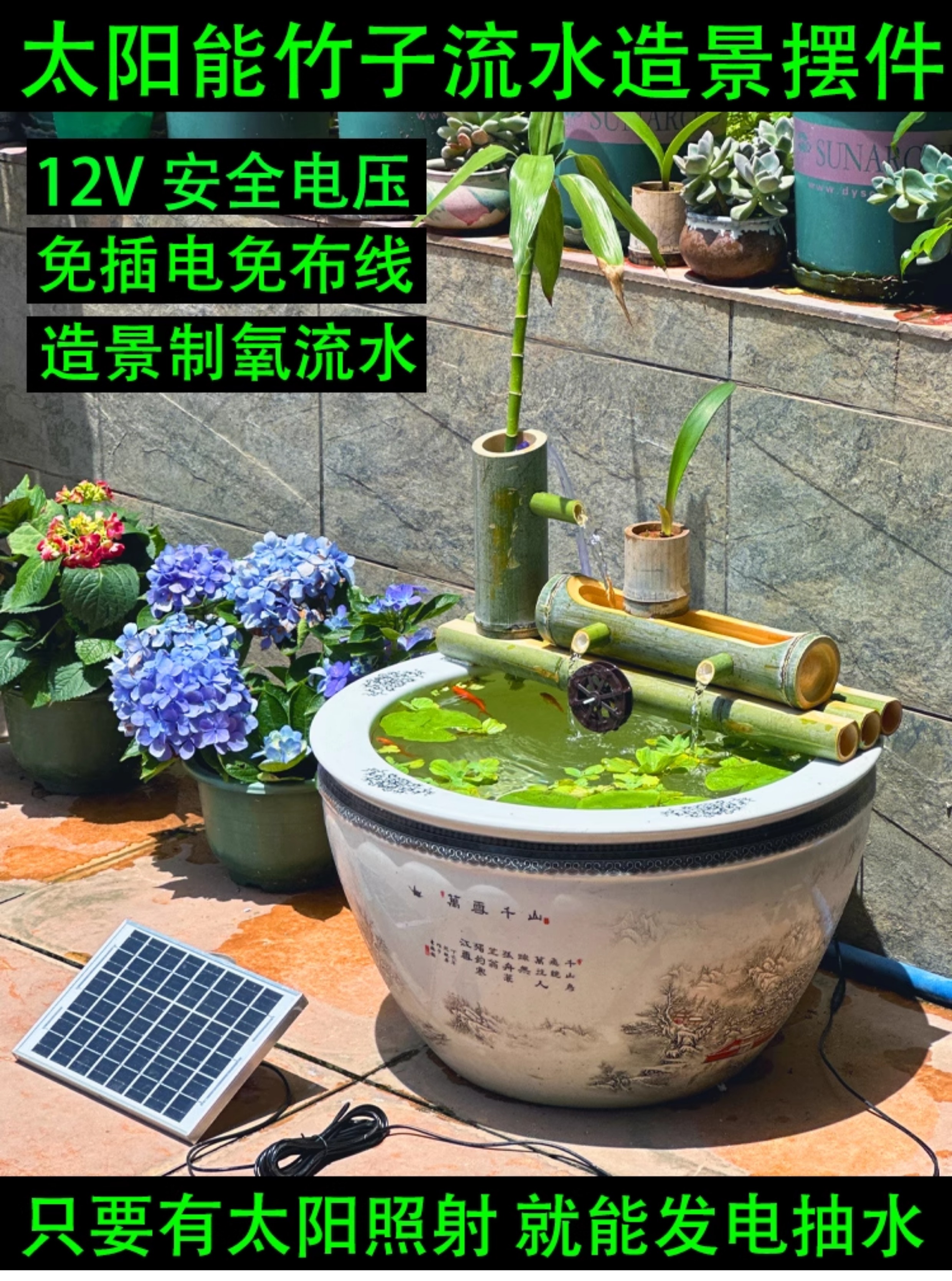 태양열 대나무 물순환기 어항 여과 산소공급 경관 분수 돌조각 장식물 물순환 시스템