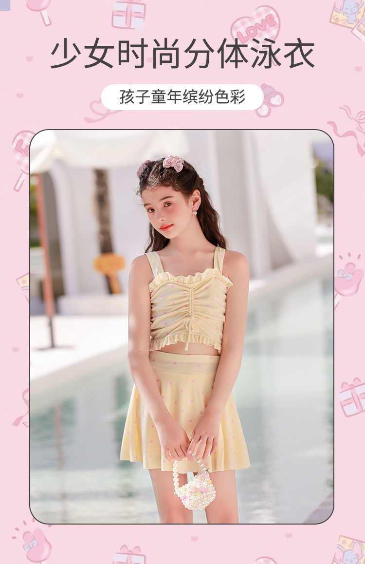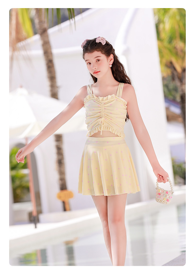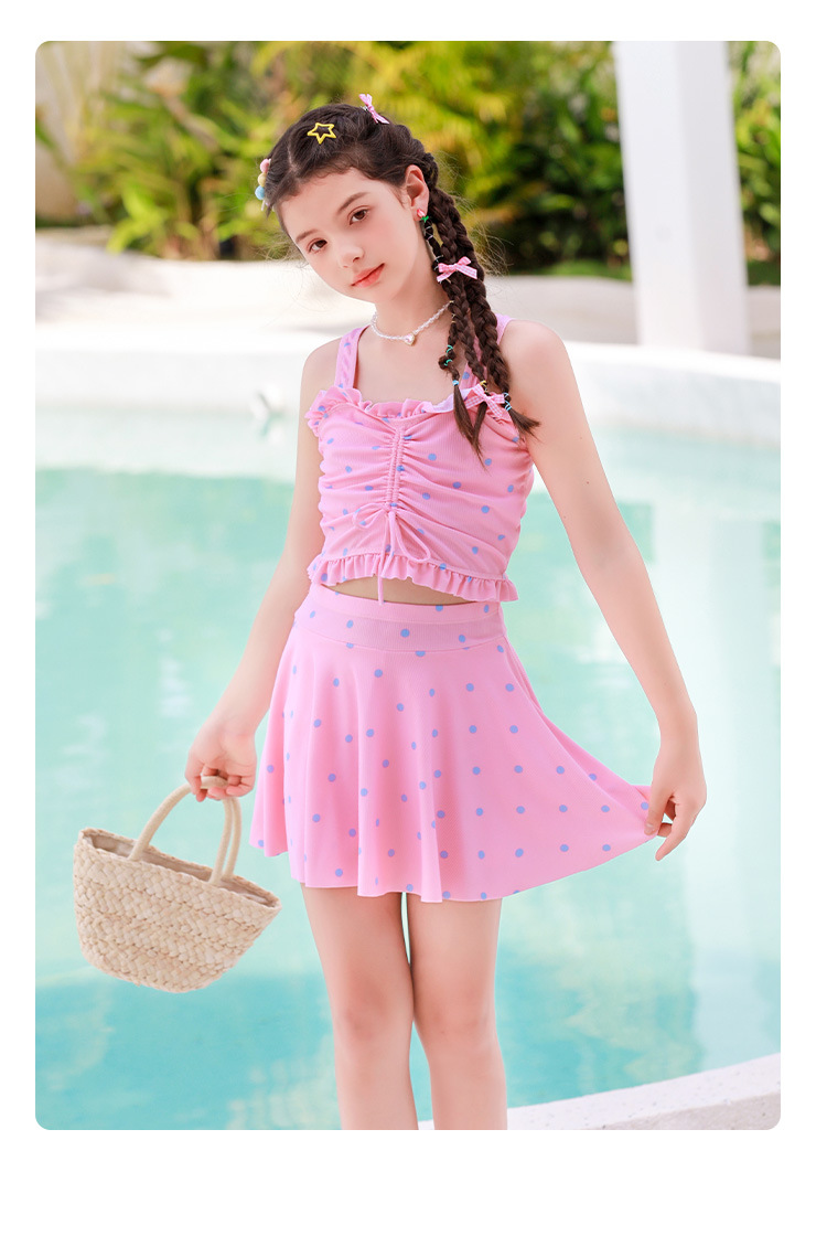 어린이 수영복 새로운 스타일의 소녀, 중대형 어린이, 귀엽고 상큼한 물방울 무늬 스플릿 서스펜더 스커트 스타일 소녀 휴가 수영복