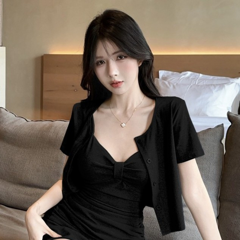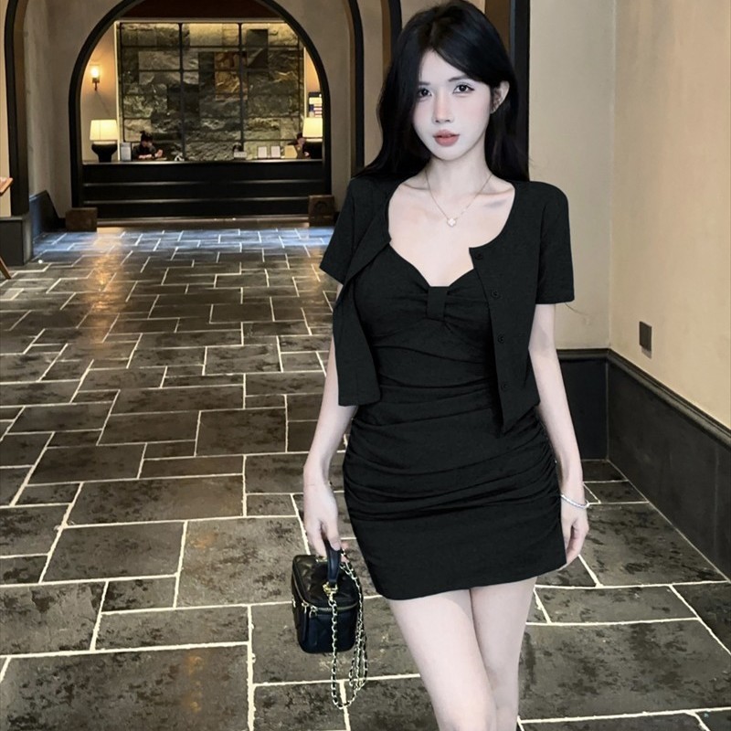 여름 핫걸 드레스 투피스 슈트, 여성스러운 브이넥 서스펜더, 가슴 패드, 힙 커버 스커트 + 자외선 차단 가디건 재킷