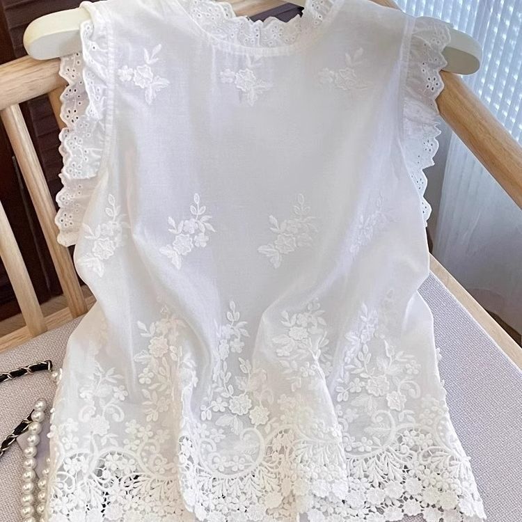 프렌치 헤비 레이스 크로셰 쉬폰 셔츠 스탠드 칼라 2025 여름 민소매 조끼 조끼 통근 탑 슬리밍스토어 가기