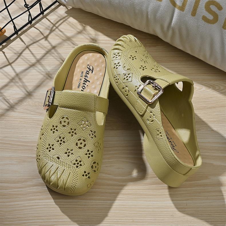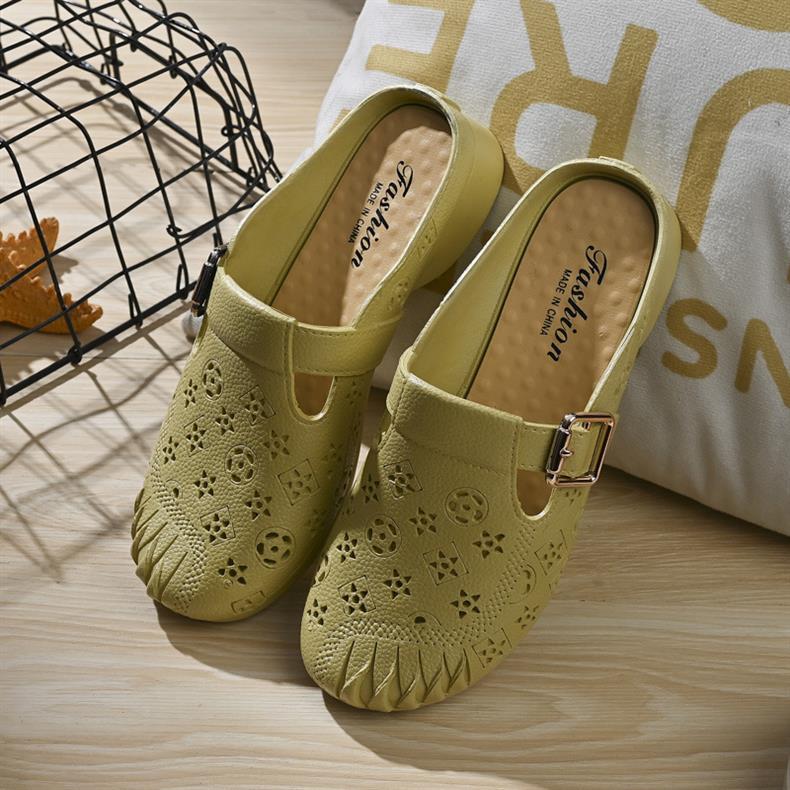 새로운 플랫 힐 미끄럼 방지 중년 어머니 발가락 슬리퍼 발가락 슬리퍼 모조 가죽 중간 굽 나막신 겉옷 여성 슬리퍼스토어 가기
