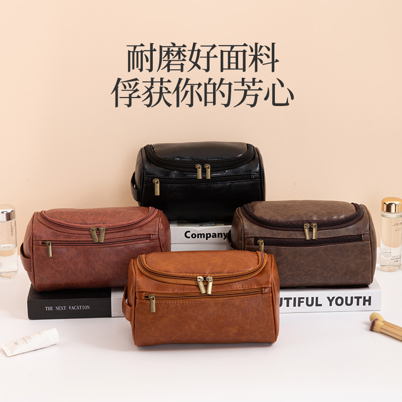 남성용 해외출장 세면도구 가방, 측면 휴대 가능, 걸이 가능한 PU 화장품 가방, 가죽 여행용품 수납 가방