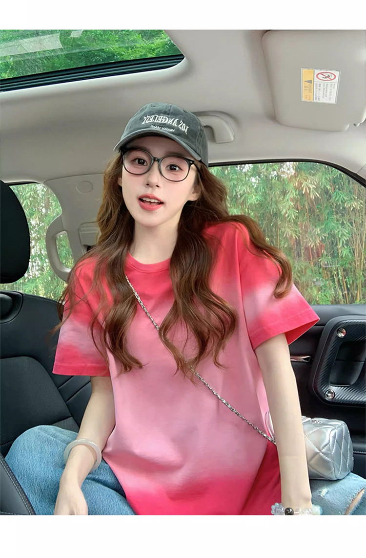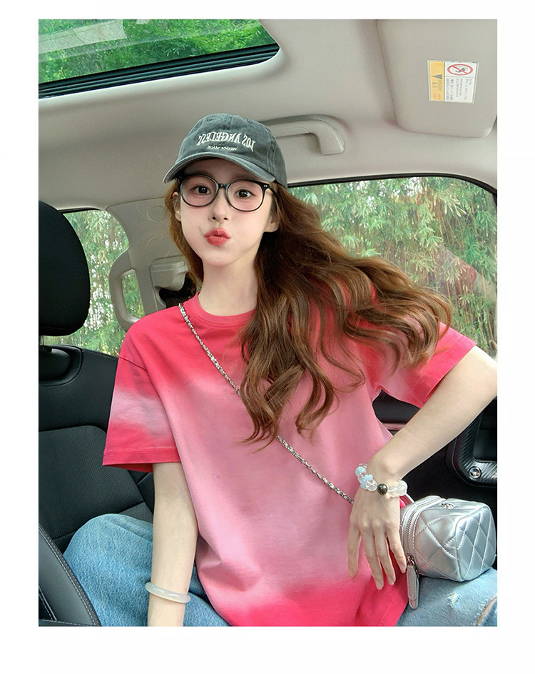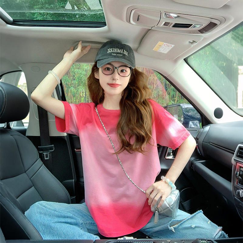 로즈 핑크 그라데이션 타이 염색 여성용 반팔 티셔츠 2025 뉴 핫 여름 미국 트렌디 브랜드 루즈 엉덩이 커버 탑 인스토어 가기