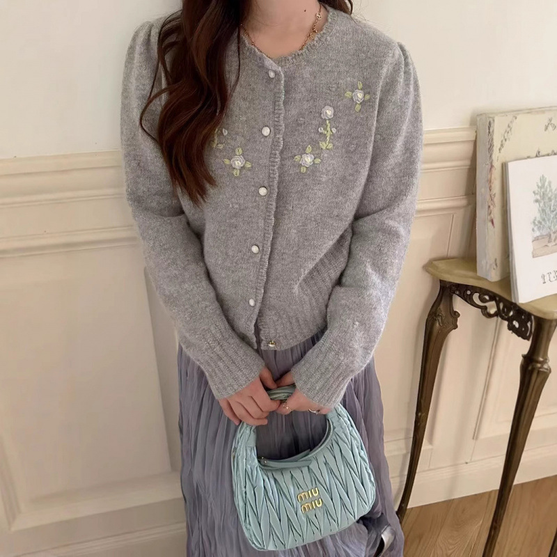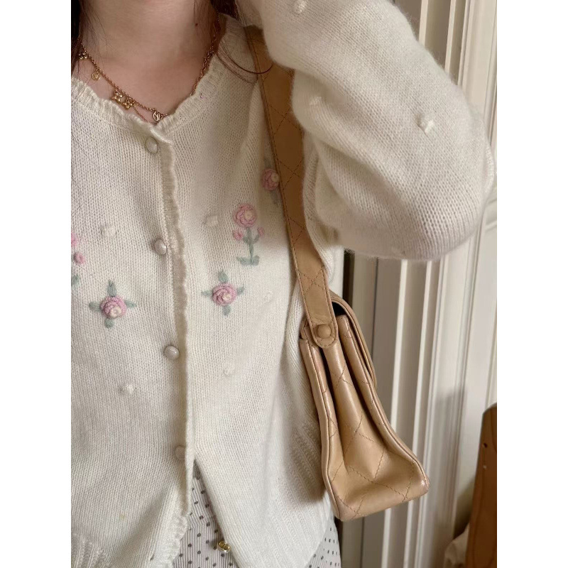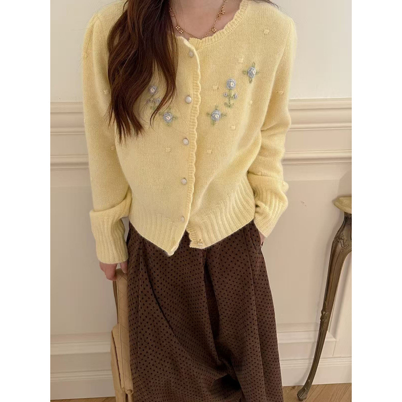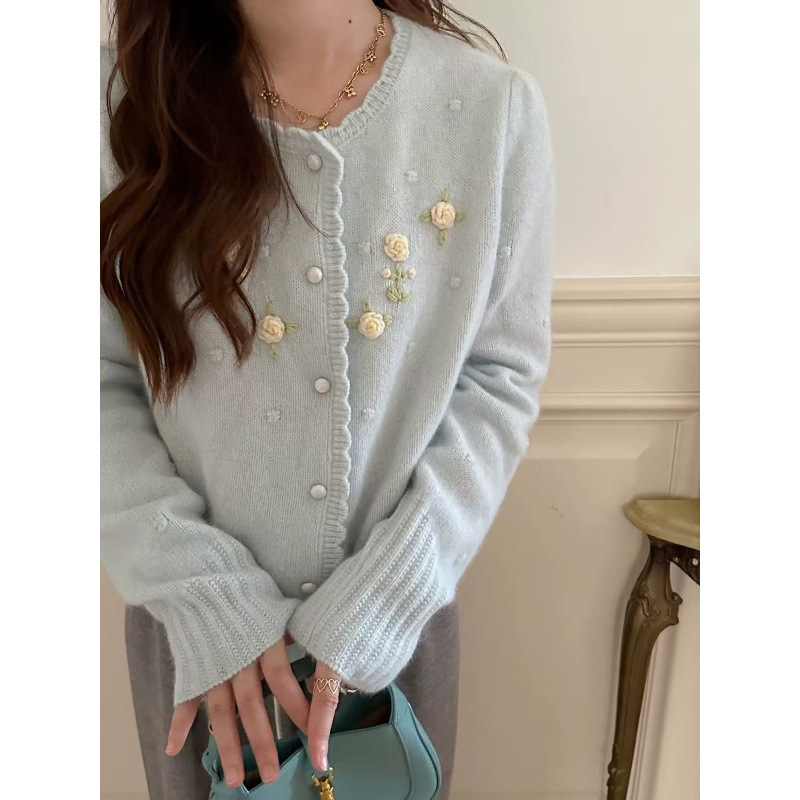 KANING 여성용 입체 꽃 부드러운 밀랍 스웨터 재킷 2025 가을 여성을위한 새로운 달콤한 라운드 넥 니트 카디건스토어 가기