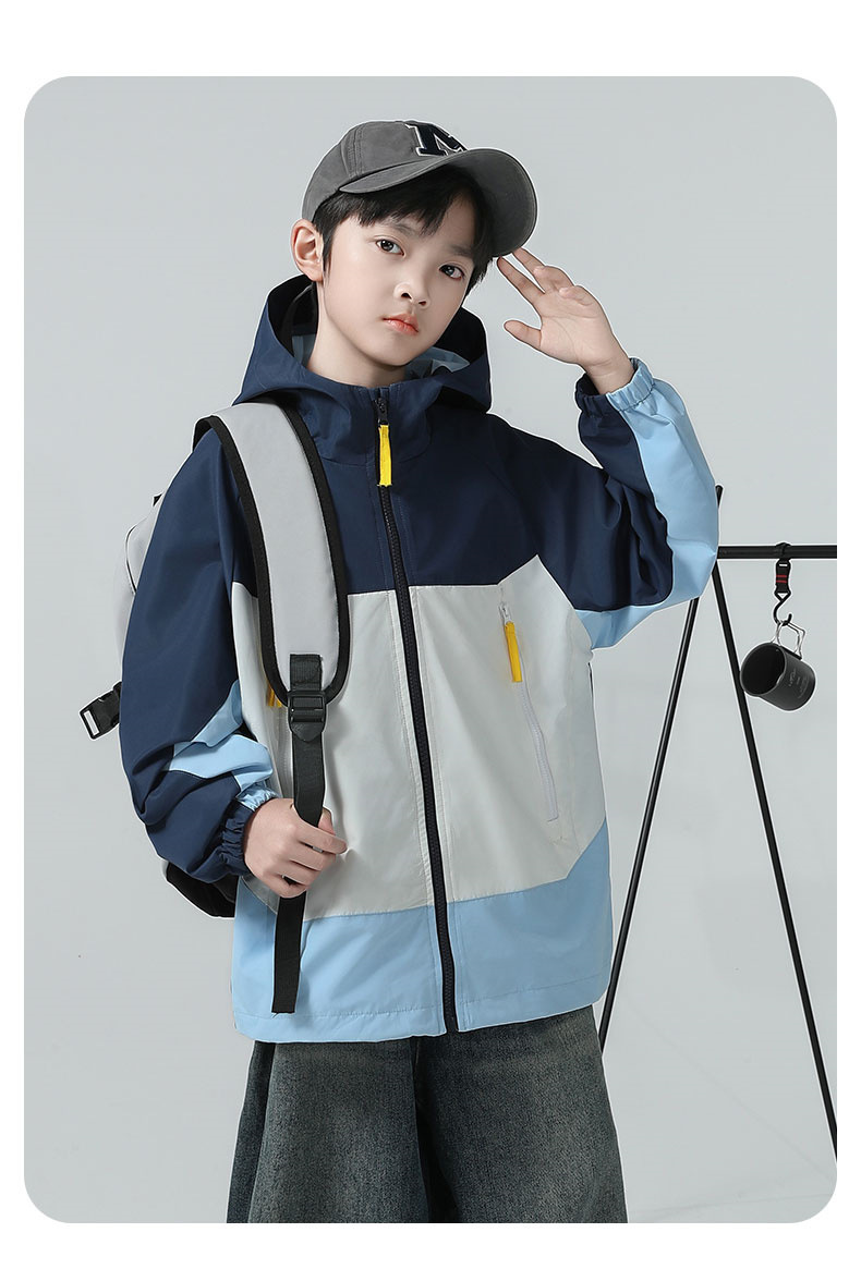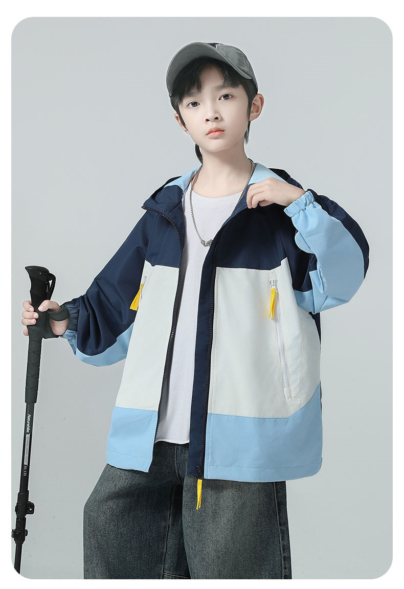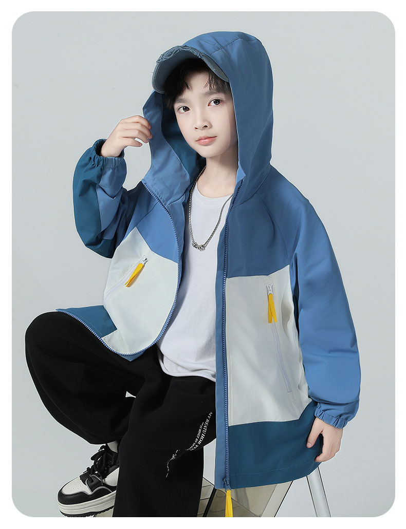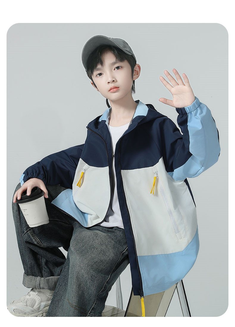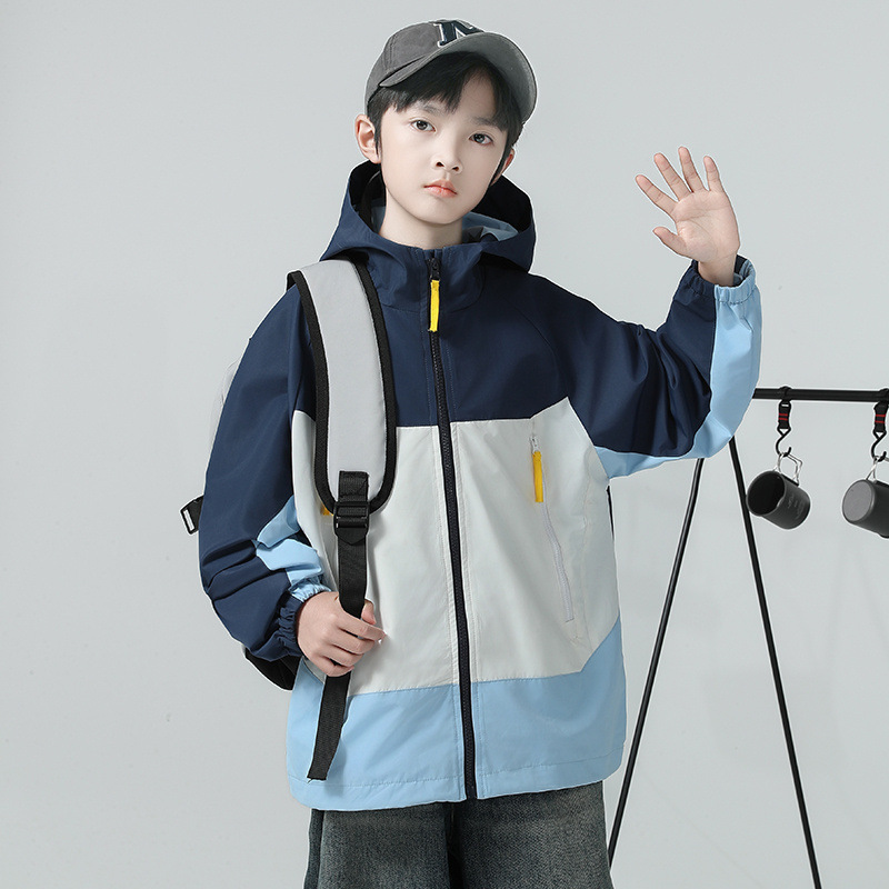 소년 코트 2025 가을 새로운 스타일 어린 소년의 세련된 컬러 블록 코트 세련된 후드 재킷 대비 색 재킷스토어 가기