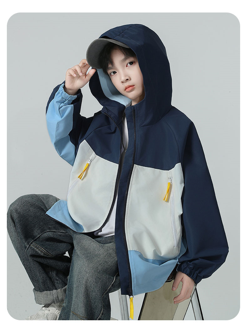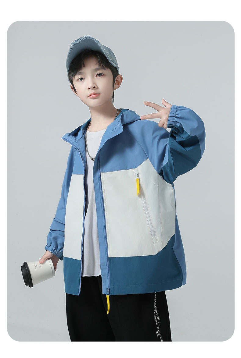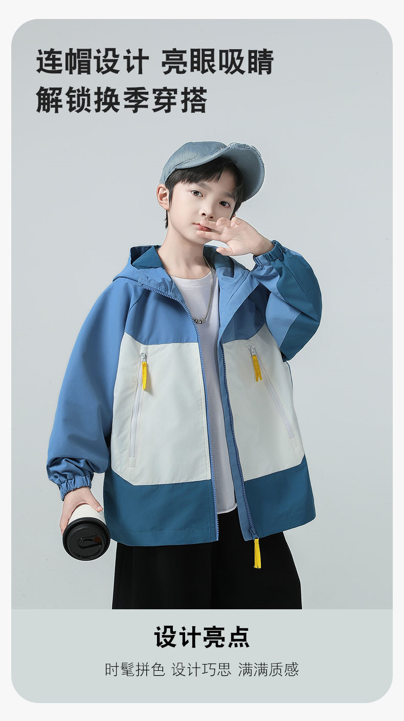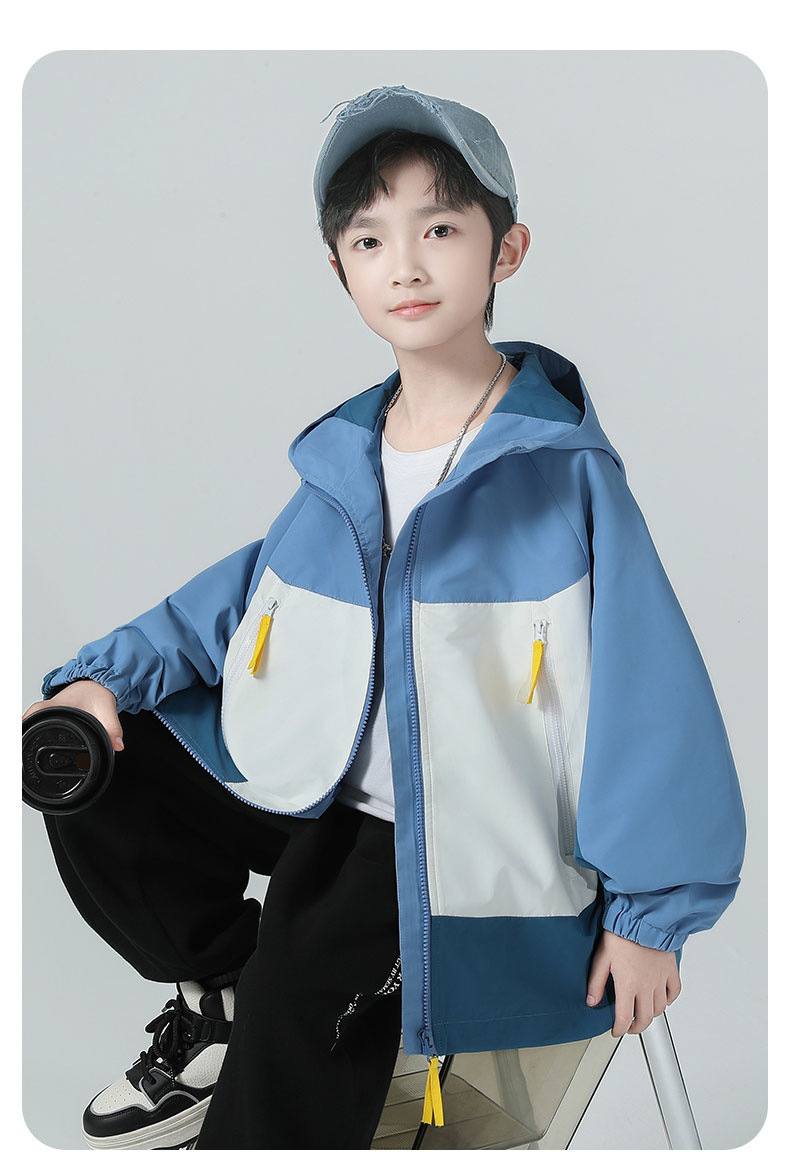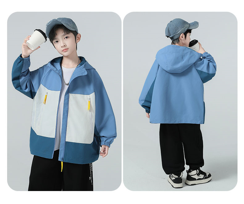 소년 코트 2025 가을 새로운 스타일 어린 소년의 세련된 컬러 블록 코트 세련된 후드 재킷 대비 색 재킷스토어 가기