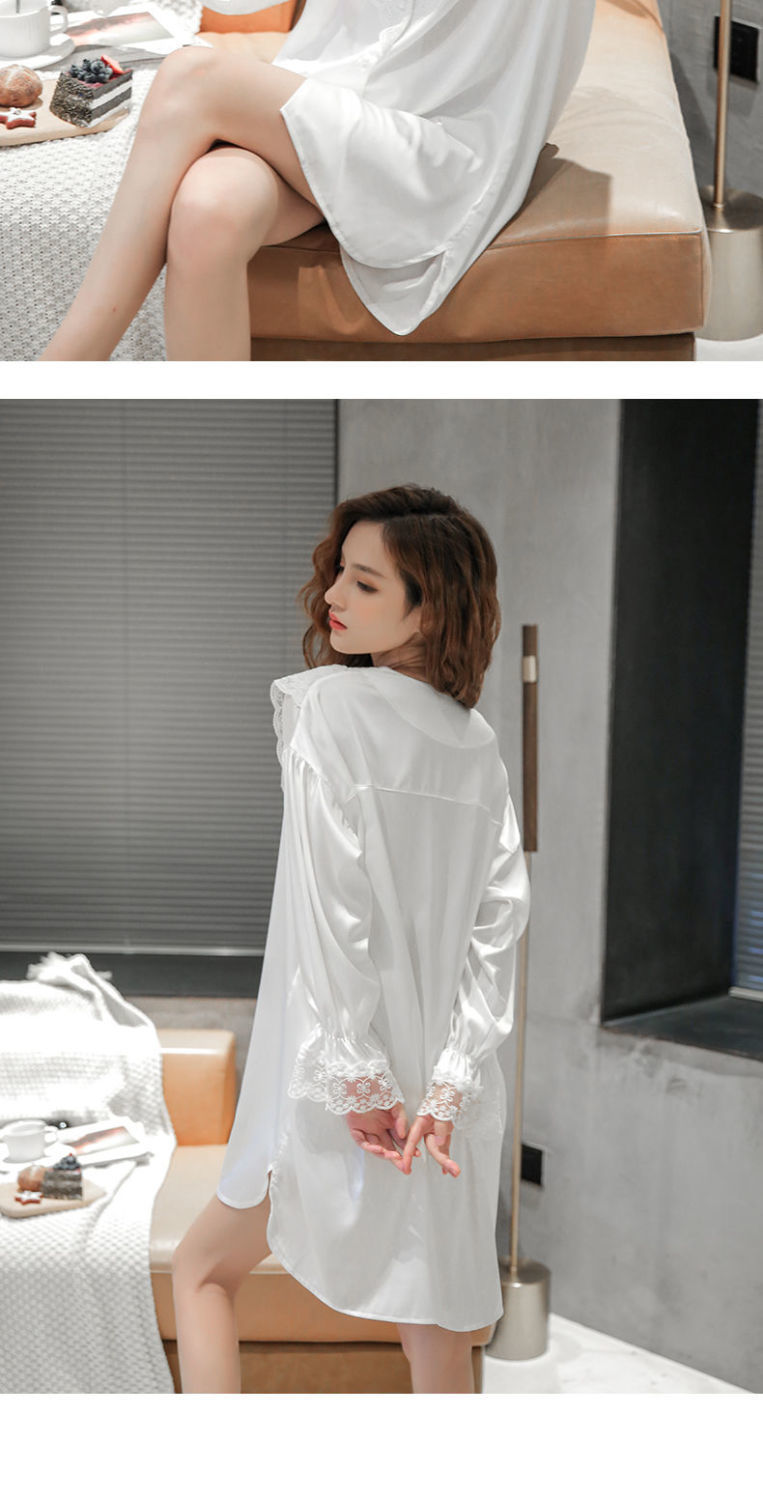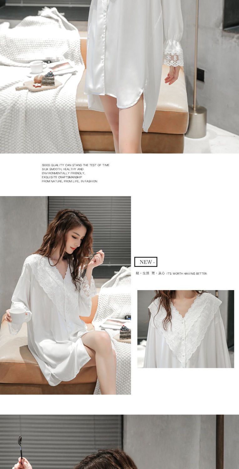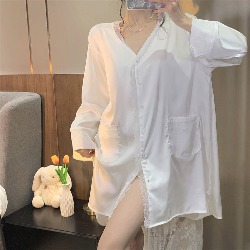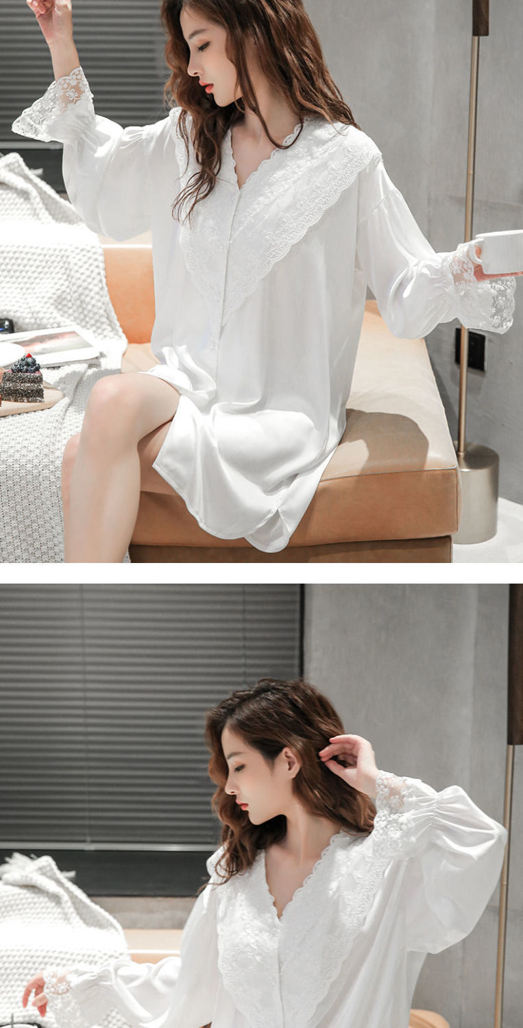 여성용 잠옷 봄, 가을 쉬폰 긴팔 달콤한 레이스 일본식 얇은 중간 길이 흰색 셔츠 잠옷 여름스토어 가기