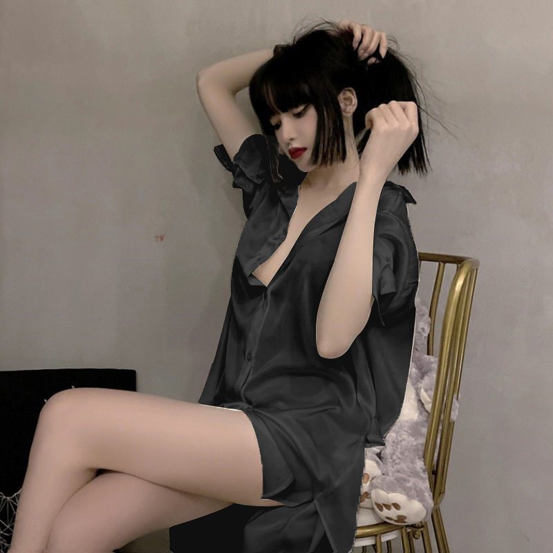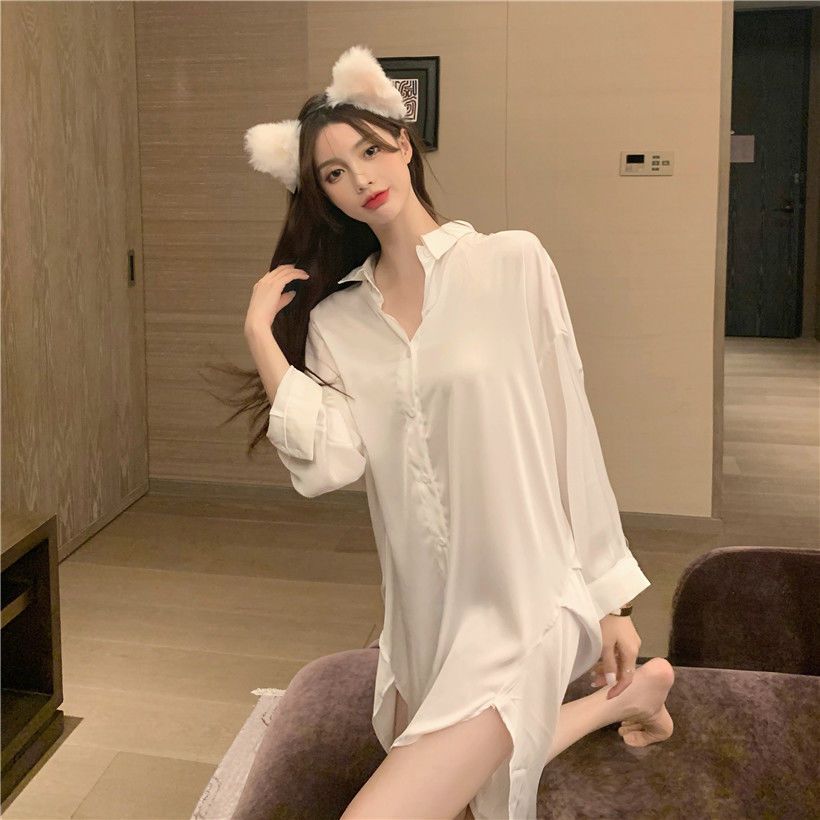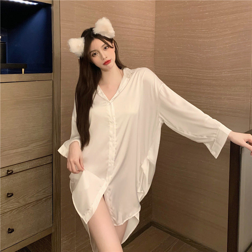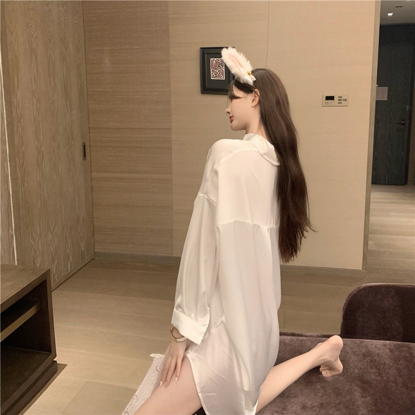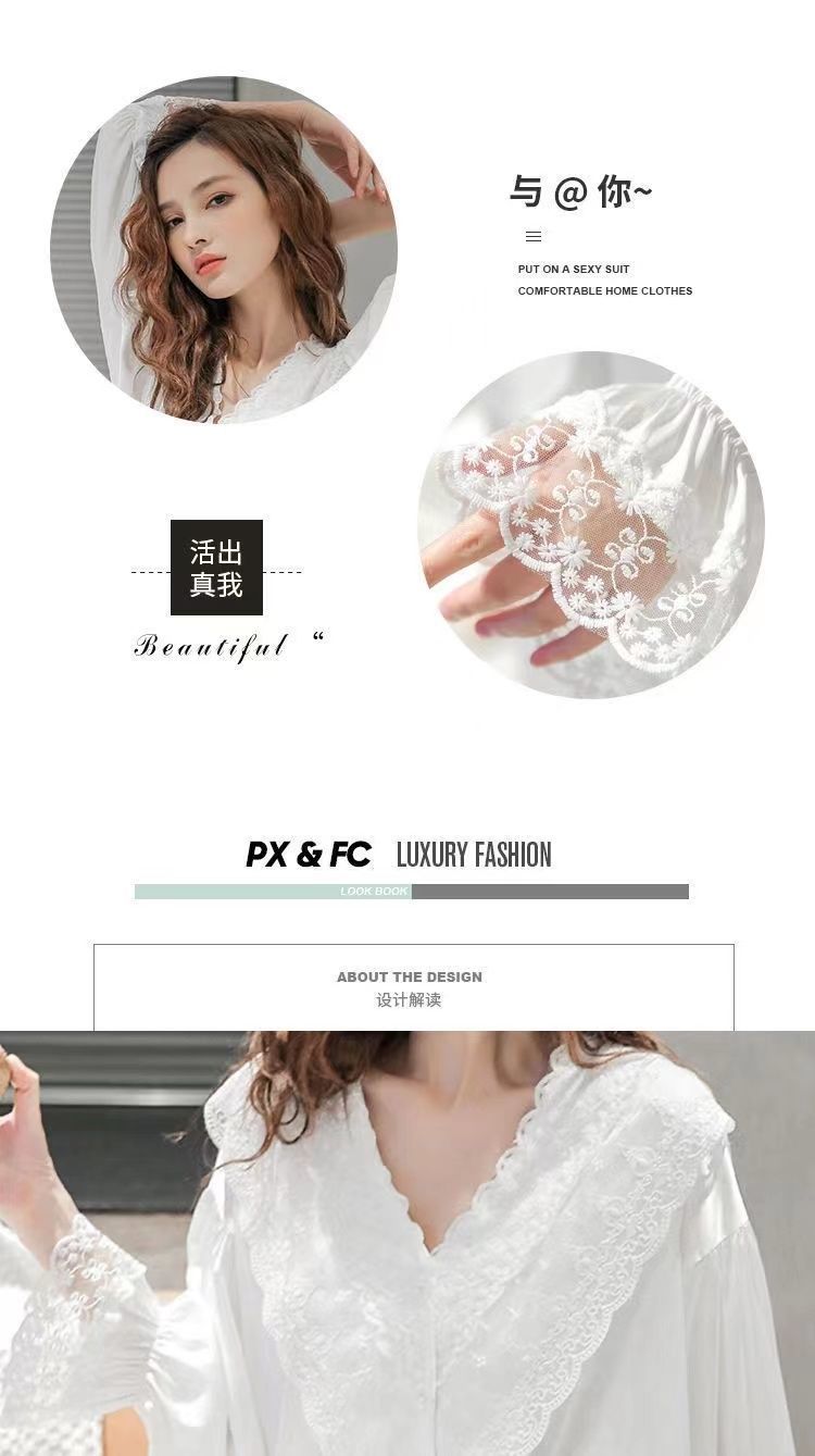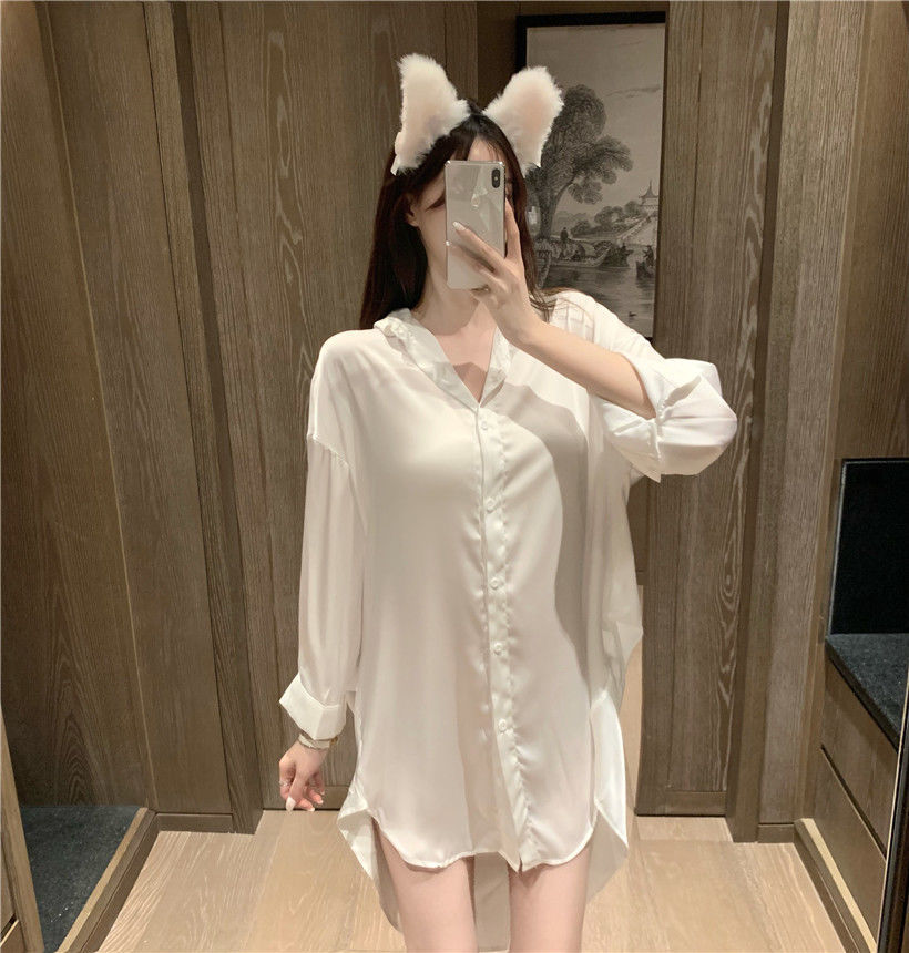 여성용 잠옷 봄, 가을 쉬폰 긴팔 달콤한 레이스 일본식 얇은 중간 길이 흰색 셔츠 잠옷 여름스토어 가기