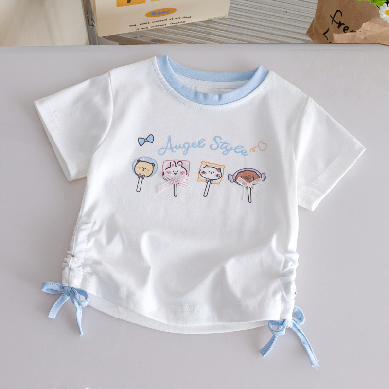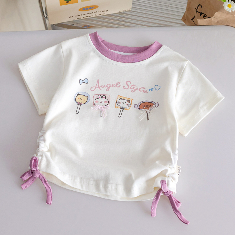 여자 만화 반팔 25 여름 새로운 귀여운 Drawstring 세련된 반팔 티셔츠 아기 소녀 다목적 컬러 매칭 탑 3스토어 가기