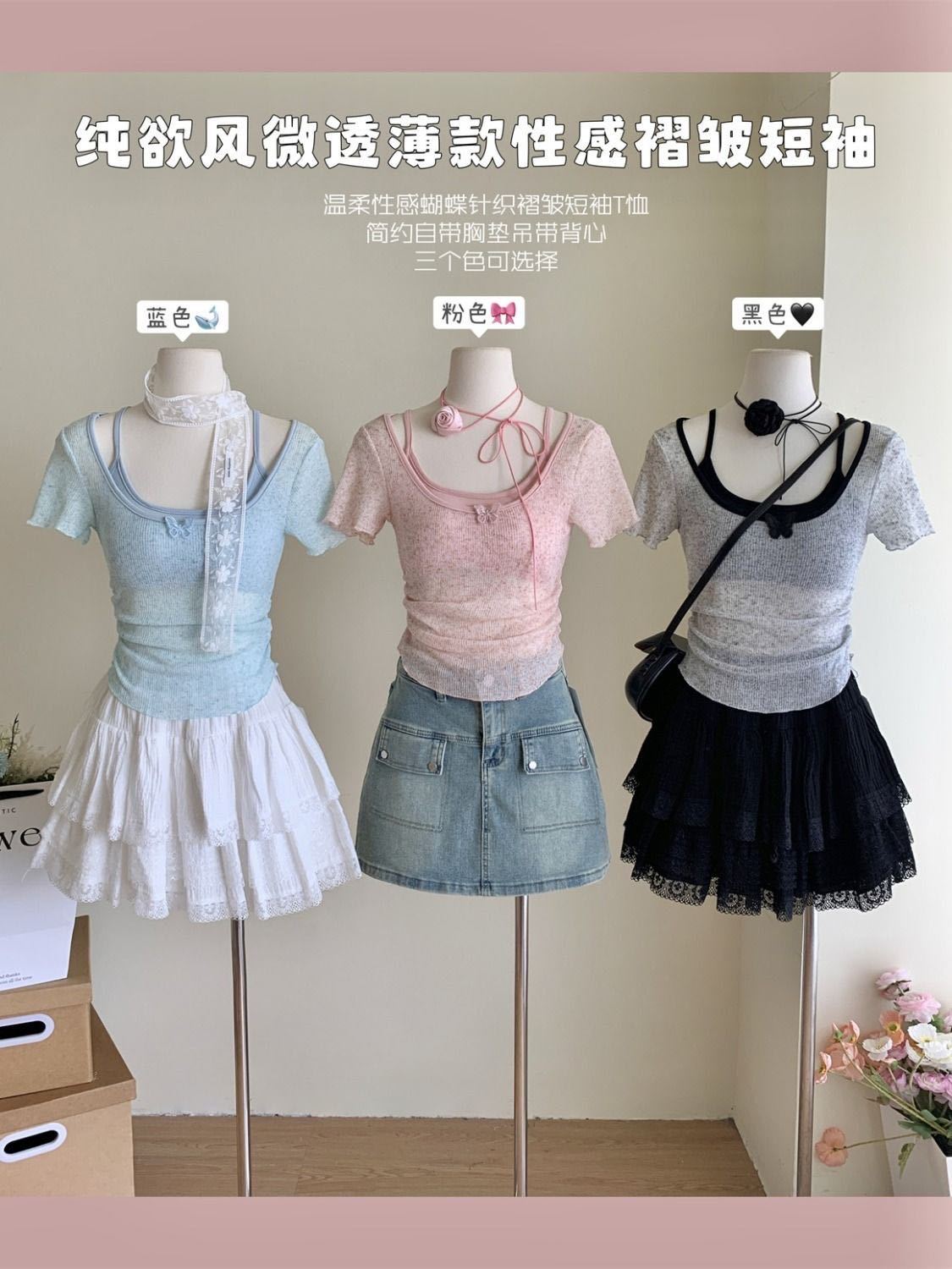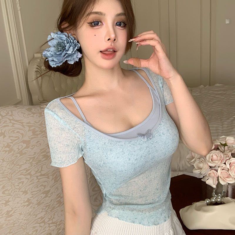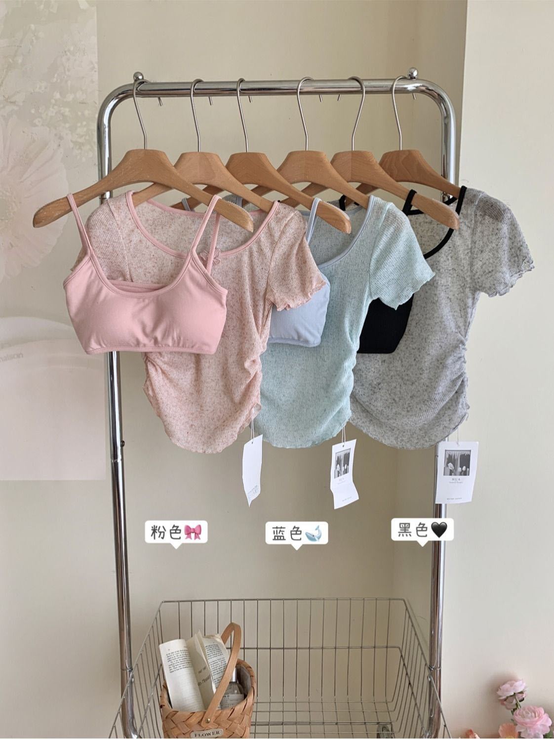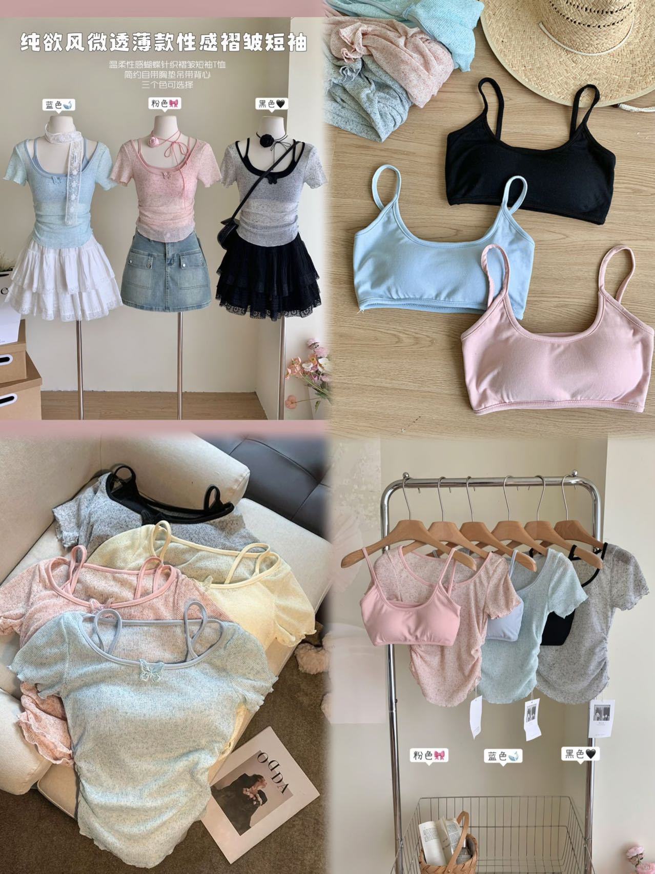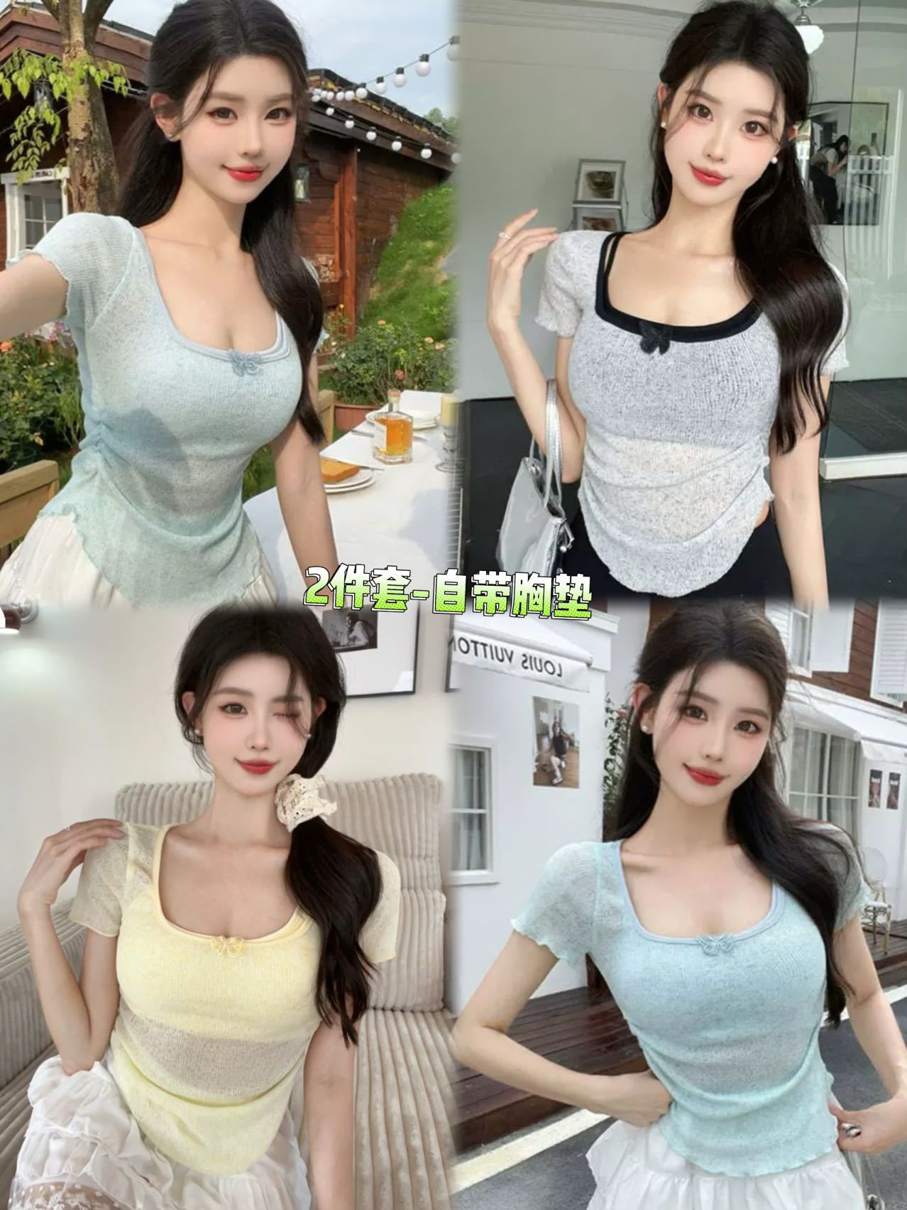 66011 # 퓨어 러스터 얇은 살짝 시스루 반팔 티셔츠 여름 패딩 캐미솔 탑 레이어드 투피스 세트스토어 가기